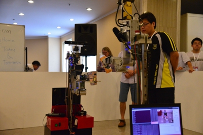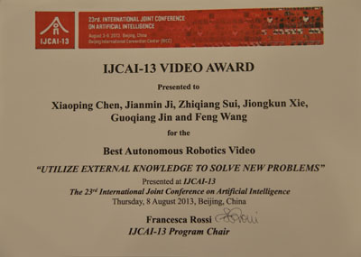 第23届世界人工智能联合大会(IJCAI 2013)于8月3日至9日在北京举行。世界人工智能联合大会是全球最高级别的人工智能会议,两年一届,国际人工智能界的最高奖历来在该会上颁发。中国科学技术大学“可佳”智能服务机器人在本届大会视频竞赛中获得“最佳自主机器人奖”,在实体机器人竞赛中以全场最高分获得“通用机器人技能奖”。