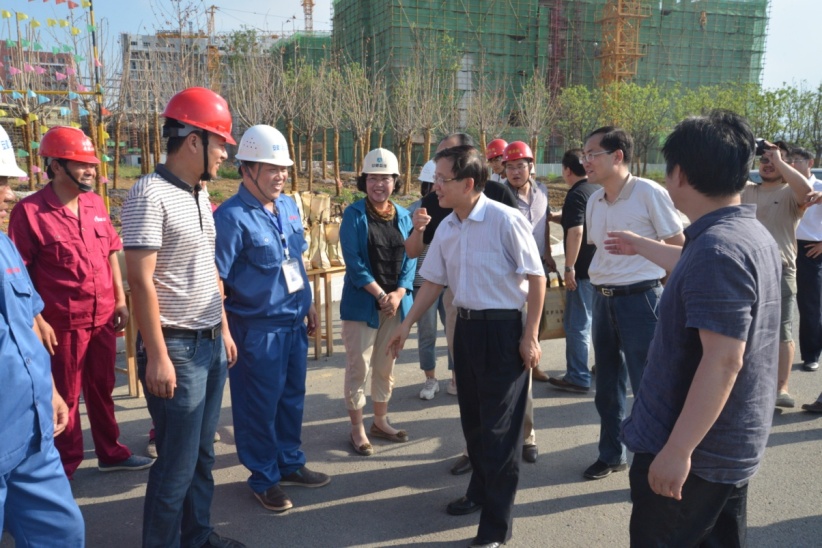 合肥高新区建设发展局局长李先强、合肥市重点工程建设局副局长杜亚斌在调研现场介绍了先进技术研究院一期施工建设的进度、预期进展及建设有关情况。侯建国校长首先代表中国科大及中国科大先进技术研究院,感谢合肥高新区、合肥市重点工程建设局及施工单位等,尤其对高温天气下坚持施工的建筑工人表示感谢,特别叮嘱全体人员注意防暑及人身安全,同时也对当前的工程进度表示满意。