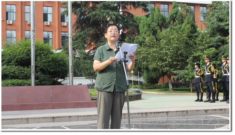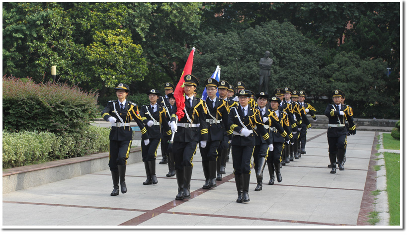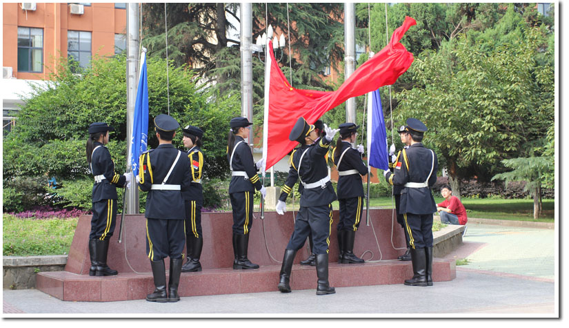 清一色的深蓝色礼服,清一色的亮白色手套,在《歌唱祖国》的明快雄壮韵律中,旗手和仪仗队精神饱满地迈着坚定的步伐整齐地前进。鲜艳的五星红旗伴着激昂有力的《义勇军进行曲》,潇洒大方地飘扬在郭沫若广场上空。院旗和校旗也伴随着校歌冉冉升起。