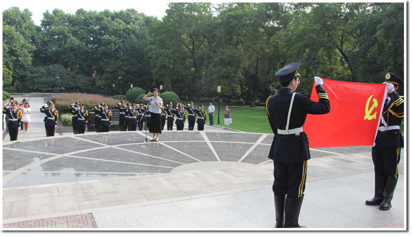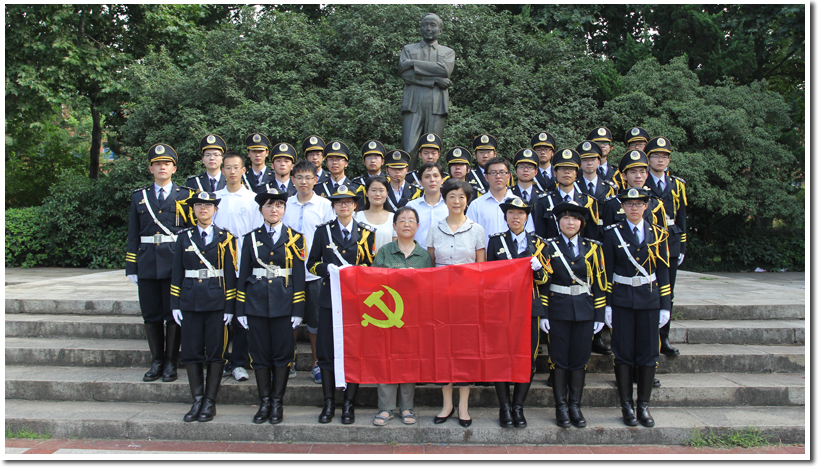 升旗仪式结束后,全体人员在郭沫若像下合影留念。本次升旗活动作为“我的中国梦”系列活动之一,升旗手和仪仗队均由物院、工院各党支部和国旗护卫队的优秀青年党员代表担任,为了准备这次升旗,大家已经连续几天顶着高温从傍晚训练到深夜。