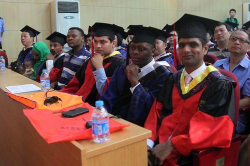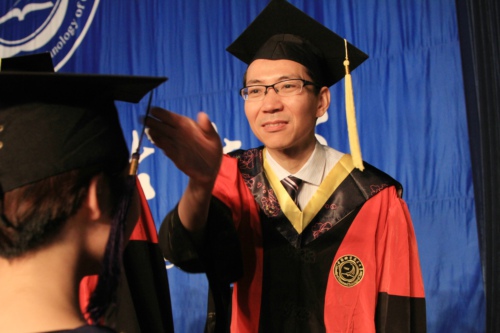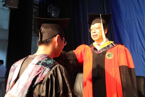 最后,在校歌的乐曲声中,同学们身着学位服依次走上主席台,校领导和导师代表们为他们一一扶正流苏。