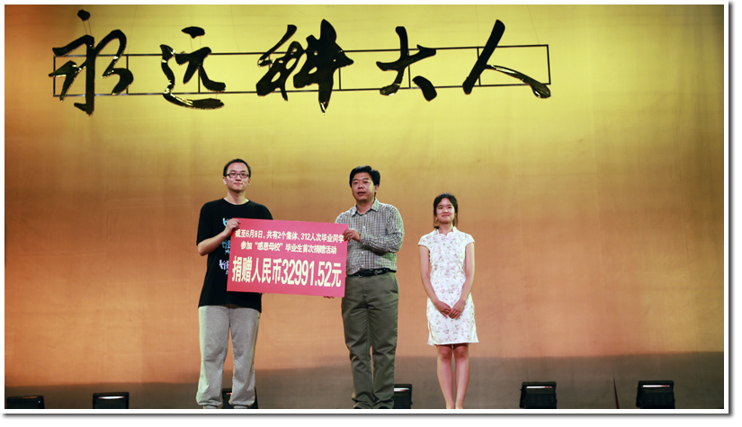 晚会进行过程中穿插了毕业生首次捐募仪式。在毕业生即将离开母校之际,校友总会以及校友服务队开展了“感恩母校”毕业生首次捐赠活动。截止6月8日,已有“多媒体与通信实验室2013届毕业生”、“0423全体同学”和共计312人次的毕业同学参与了这项活动,共捐赠人民币32991.52元。校友总会副会长兼秘书长、教育基金会副理事长朱东杰代表学校教育基金会接受了毕业同学们的爱心捐赠。