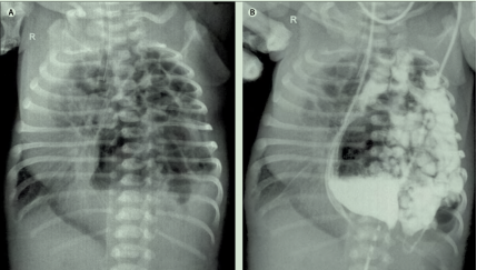 这样的病例在临床并不十分罕见,影像科的准确检查,对临床有效进行病情评估,选择适合的治疗方法和手术方式都提供了重要帮助。X线检查可鉴别膈肌麻痹、先天性肺畸形和胸腔内占位性病变及气胸、纵隔肿块和先天性膈疝。
