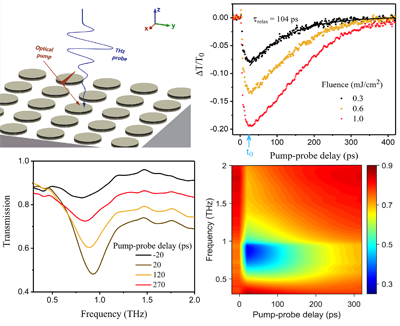 硅介质超表面器件示意图以及其对太赫兹波超快调控的实验结果