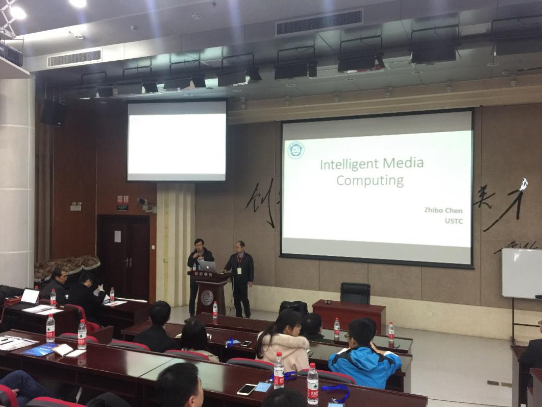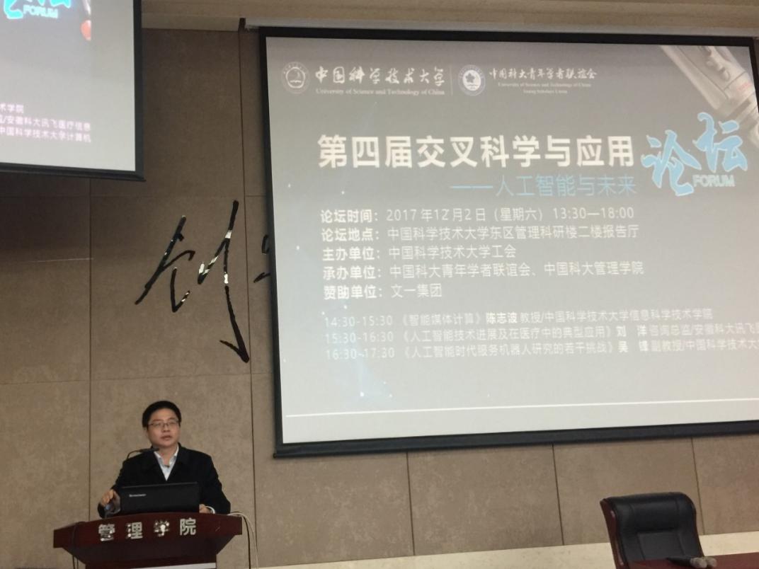 随后,中国科大陈志波教授作了《智能媒体计算》的报告,分别从地质学科、医疗、图像媒体分析优化及媒体质量评价四个方面,探讨如何使用人工智能技术进行相关研究,并与大家共享了当前的研究成果。安徽科大讯飞医疗信息技术有限公司刘洋总监作了《人工智能技术进展及在医疗中的典型应用》的报告,介绍了人工智能产品——晓医机器人在医院中的应用,并表示讯飞语音技术有望被引入医院诊室协助医生实时记录诊治过程。中国科大计算机科学与技术学院吴锋副教授作了《人工智能时代服务机器人研究的若干挑战》的报告,分析了机器人发展的历史变化,探讨了当前人工智能时代下实验室里机器人研究的易与难,并就相关难点给出自己的解决思路。