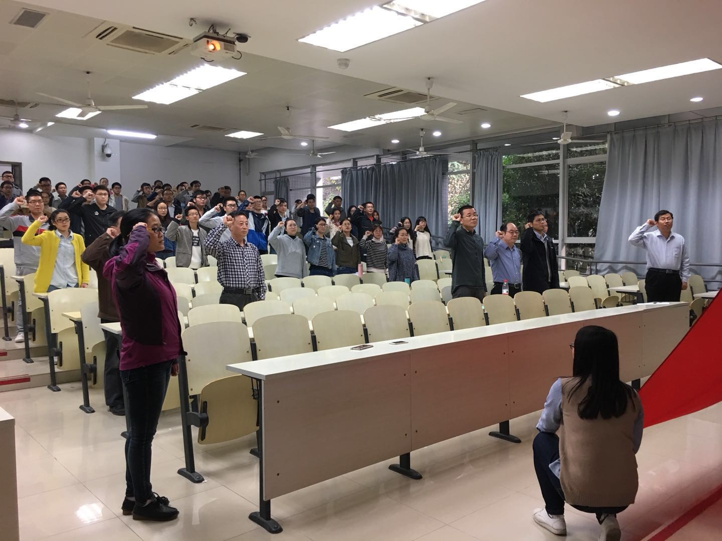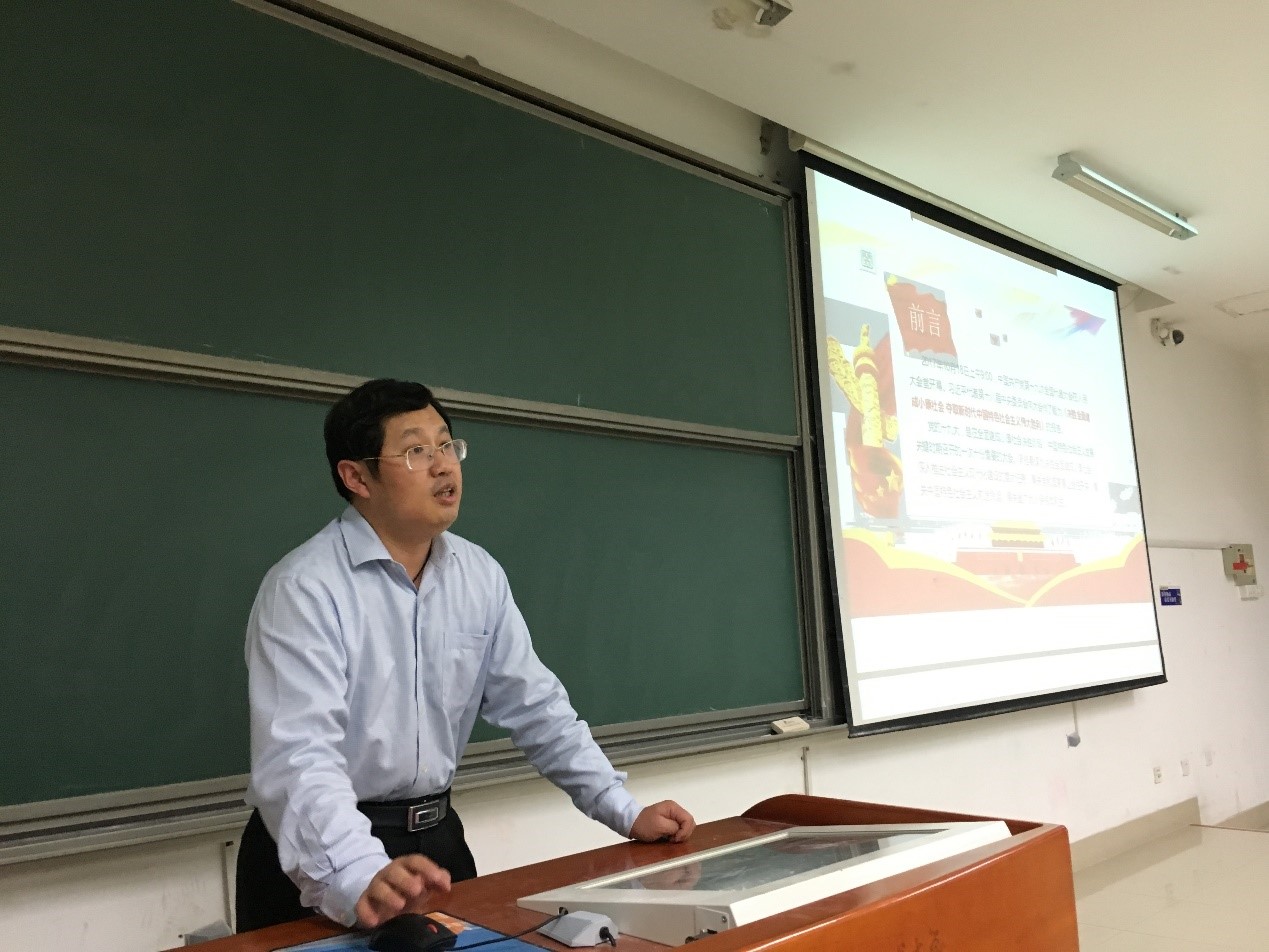 11月8日下午,数学科学学院党委书记邓建松在五教5102教室为学院全体党员同志讲授以“学习贯彻十九大精神及习近平新时代中国特色社会主义思想”为主题的党课,引导大家认真研读党的十九大报告和十九大修订的党章。学院全体教工和学生党员、民主党派、无党派代表参加了学习会。