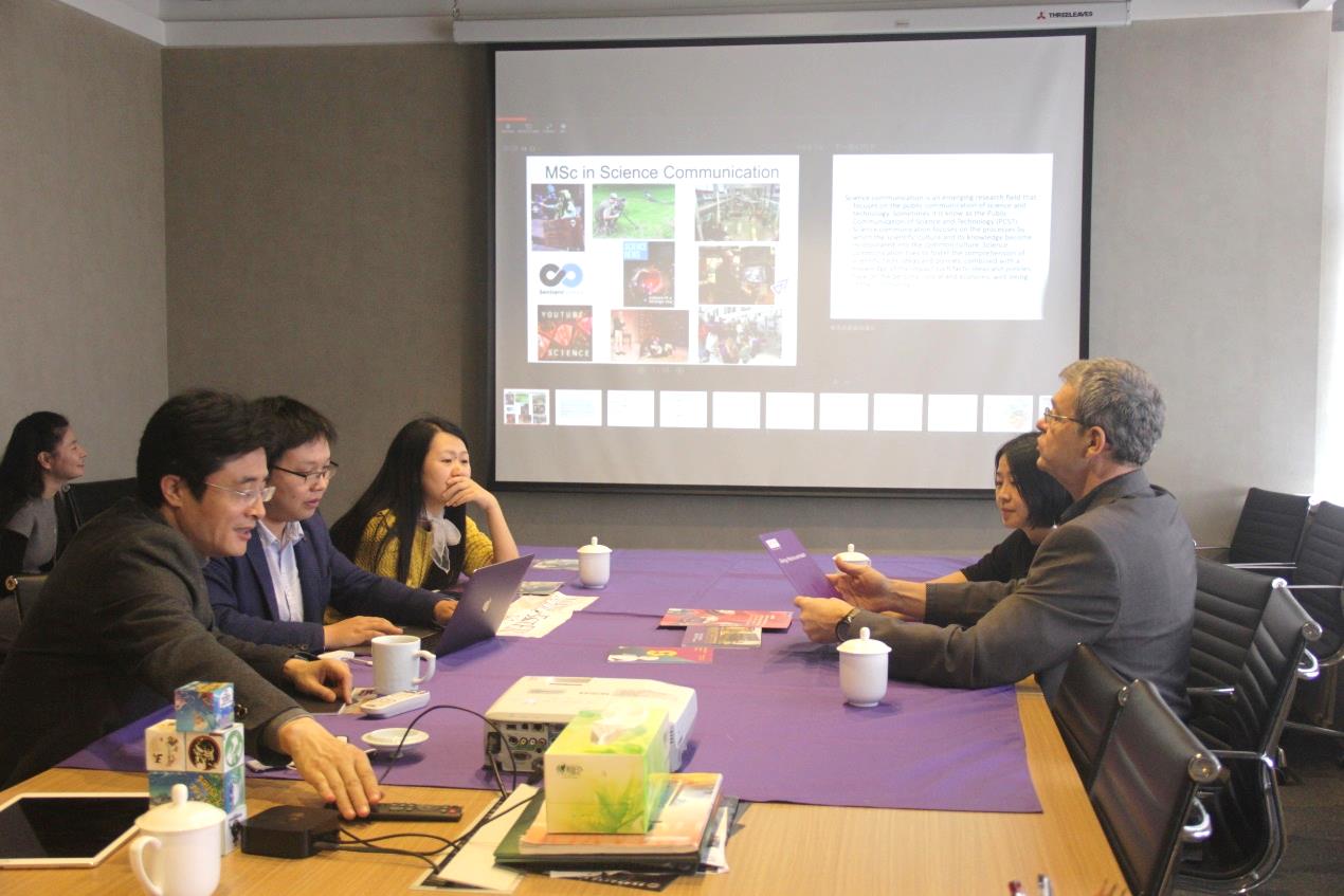 会上,周荣庭介绍了我校科技传播与科技政策系的概况和主要研究成果,其中包括“消失的世界”和“美丽化学”等项目。扬科维奇教授介绍了曼彻斯特大学科技交流、学习计划、课程安排、指导项目、学术论文以及研究生教学计划等情况。