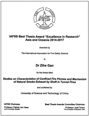 火灾科学国家重点实验室博士高子鹤荣获2017年国际火灾安全科学学会最佳学位论文奖