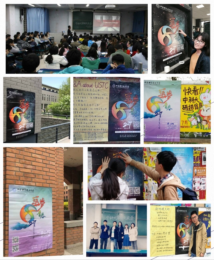 线下宣传掀高潮。4月初,研究生院发出了第一批一千余份研招宣传海报,通过志愿者共同努力,已在98所高校完成张贴。不少志愿者的海报创意十足,如制作手绘海报、在海报上附贴科大精美明信片等方法收到了良好的宣传效果。除此之外,中山大学等部分高校志愿者,联合学生会或团委,在校内开展保研、考研经验交流会,推进“学长喊你上科大”的宣传活动。