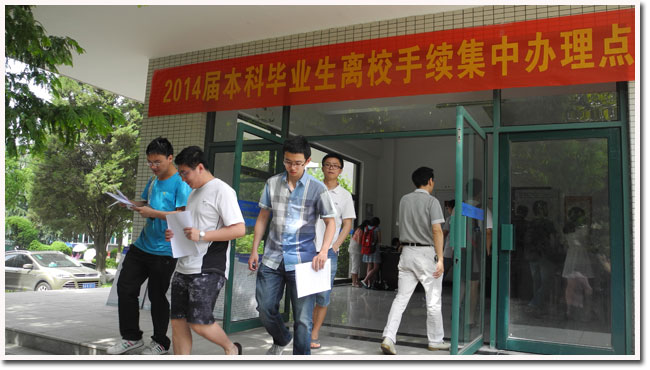 5月27日,学校在学生服务中心设立本科毕业生离校手续集中办理点,由学生工作部处牵头,汇集组织部、财务处、图书馆、网络信息中心、学生工作处助学办公室、中国银行等部门,为2014届本科毕业生集中办理接转组织关系、补交学费、归还图书、结算网络费用以及偿还助学贷款等手续。
