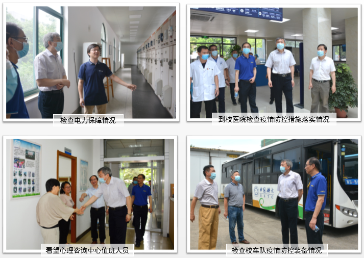 在车队和保卫处,舒歌群检查了校园巴士疫情防控装备,询问汛期对于校园巴士线路的影响,并看望了正在执勤的保卫人员。他说,大家要时刻保持昂扬斗志,尽职尽责做好工作,保证校园安全和稳定。