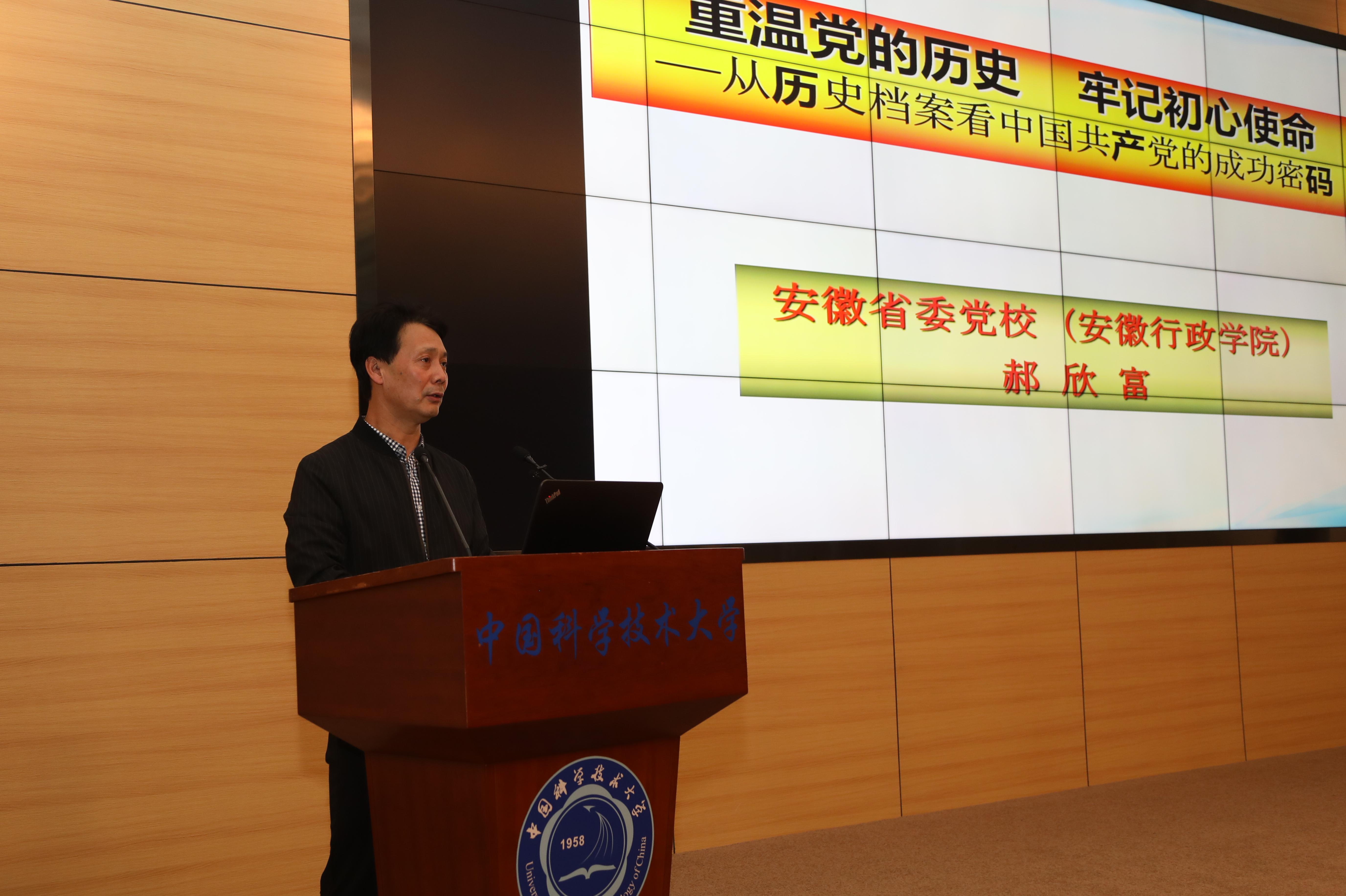 郝欣富以《重温党的历史不忘初心使命——从历史档案看中国共产党的成功密码》为题,围绕“从《共产党宣言》到《中国共产党宣言》”“从第一部党章到第一个入党誓词”“从书信往来到领袖家书”“从三大纪律到赶考规矩”四个方面,用珍贵的历史档案,图文并茂地讲述了中国共产党从孕育、诞生,到茁壮成长的艰辛历程。