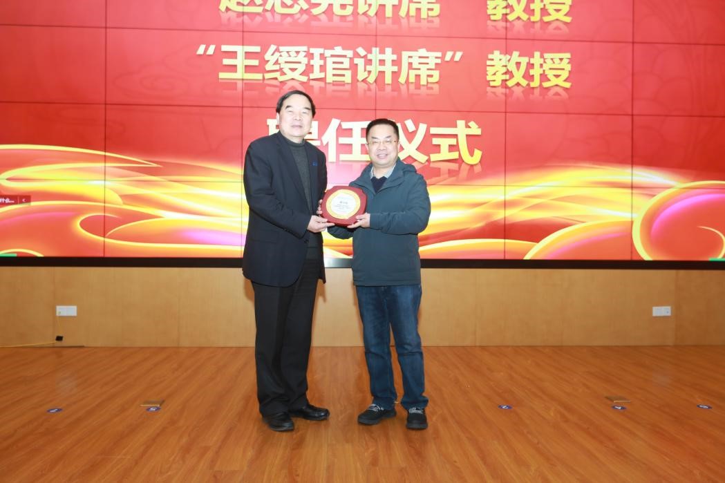 物理学院执行院长陈宇翱宣读了聘任文件。校长包信和为赵政国院士颁发“赵忠尧讲席”教授聘书,为戴子高教授颁发“王绶琯讲席”教授聘书。