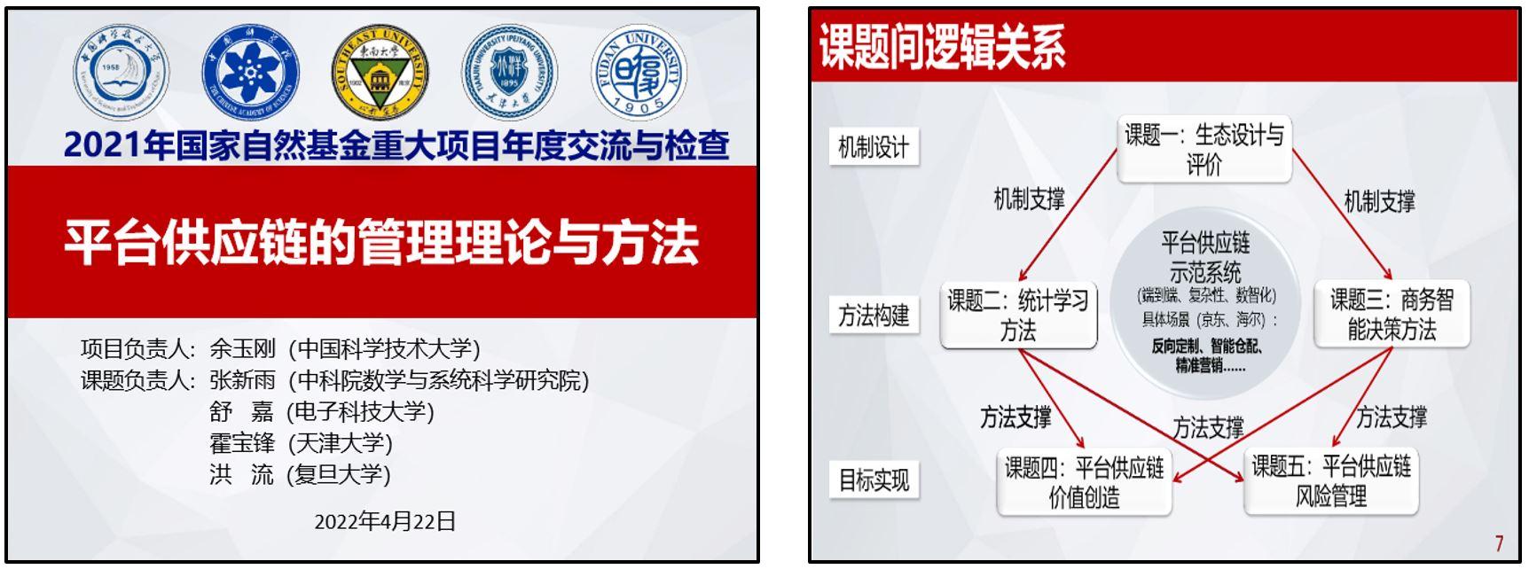 2022年4月22日上午,由中国科学技术大学管理学院余玉刚教授牵头的国家自然科学基金重大项目“平台供应链的管理理论与方法” 2021年度评议交流会,在北京市海淀区西郊宾馆5号楼召开,会议采用线下+线上方式同步进行。基金委管理科学部刘作仪副主任、霍红副处长,哈尔滨工业大学李一军教授,上海交通大学陈方若教授,华中科技大学邓世名教授,浙江大学华中生教授,中山大学王帆教授等专家,重大项目各课题负责人中国科学技术大学余玉刚教授、中国科学院数学与系统科学研究院张新雨教授、电子科技大学舒嘉教授、天津大学霍宝锋教授、复旦大学洪流教授,以及京东集团技术副总裁梅涛等专家老师约50余人线上参会。