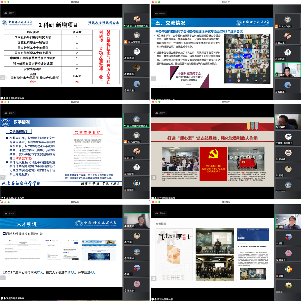 科技史与科技考古系执行主任钮卫星教授、科技传播系执行主任周荣庭教授、科技哲学系副主任王高峰副教授、心理学系张效初教授、语言科学交叉研究中心凌震华教授、艺术与科学研究中心副主任梁琰副教授分别从教学情况、科学研究、学术交流、学科建设、师资队伍建设、人才引进、平台建设、学生工作、社会服务等方面详细介绍了本单位2022年度取得的成绩,指出存在的问题和不足,并就2023年各项工作开展规划。今年各系(中心)工作存在诸多亮点:教育教学方面,2022年学院共开设本科课程(含专业课和通识课)52门次、77个课堂,选课4519人次;研究生课程(含专业课和公共课)89门次、158个课堂,选课10400人次。我院教职工获批省级质量工程7项,其中教学研究项目、课程思政示范课程、一流教材建设各2项,安徽省教学成果奖1项。科研方面,全院2022年新增纵向项目24项,新增国家级项目12项,其中国家社科重大项目1项、面上项目3项、青年项目1项、一般项目5项、其他项目2项。2022年全院累计发表论文126篇,其中何晓松教授作为独立一作兼共通讯的论文在ScienceAdvances上发表,孔燕教授及其博士生陈昌霞的论文被《中国社会科学文摘》全文收录。平台建设方面,学院科学教育与传播安徽省哲学社会科学重点实验室、科技考古与文化遗产保护安徽省哲学社会科学重点实验室获批立项;协助校文科建设办公室,完成对“科技人文高等研究院”建设方案的制定及其专家论证;落实民生银行同学校的合作协议,通过“人文与书法研究中心”的建立争取到对学院学科发展的专项资金投入。人才队伍建设方面,2022年引进教授2人,特任教授1人,特任副研究员转副教授1人,特任研究员报到1人,特任副研究员、博士后报到10人。对外交流与合作方面,学院与南京艺术学院设计学院合作建立了艺术与科学创研平台;与中科院深圳先进技术研究院签订“大中学校创新型人才协同培养路径研究”合作协议;与语音及语言信息处理国家工程研究中心、科大讯飞、中国科大附一院等单位达成协作。举办和参办10余场学术会议,开展了30余场品牌论坛报告及20余次各类学术专题讲座。国际知名天文学史期刊Journalof Astronomical History and Heritage (JAHH,SSN:1440-2807)正式落户人文学院;汤书昆教授团队的系列研究成果《中国手工纸文库》作为讲好中国故事的原创学术成果入选了迎接党的二十大召开的重要汇报展一“奋进新时代”主题成就展。