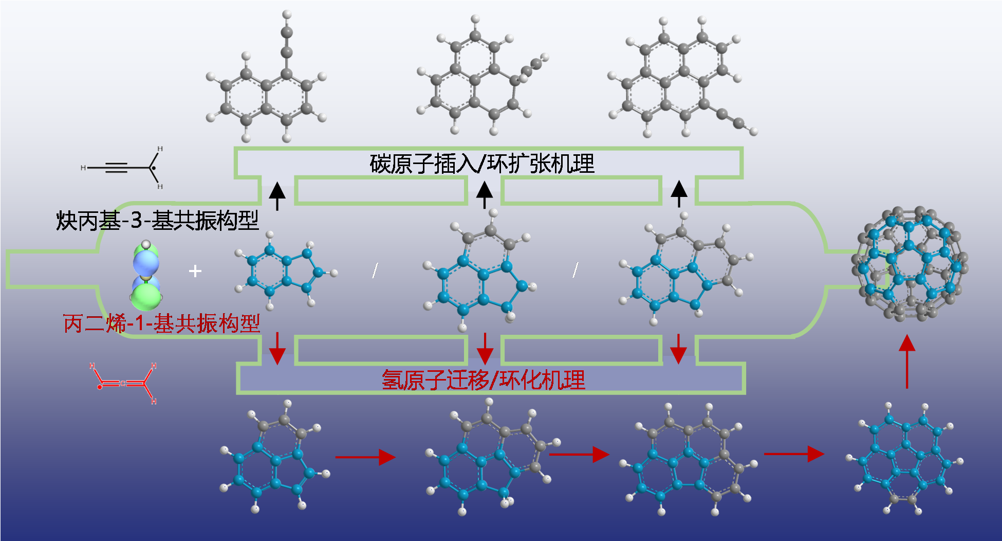 图2.炔丙基共振电子构型分别与茚基、苊基、环戊并菲基反应,经不同机理实现多环芳烃质量增长