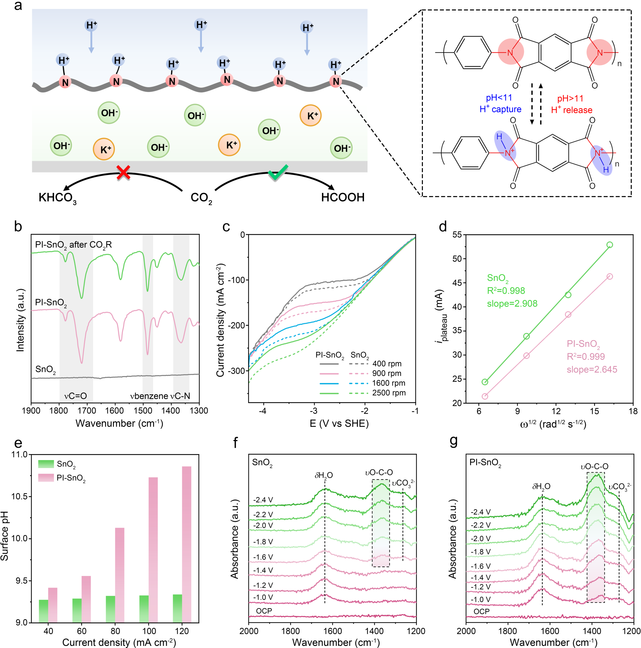 为克服酸性CO2R中的内在权衡,研究人员在SnO2纳米颗粒上修饰聚酰亚胺(PI-SnO2),这种耐酸性胺基聚合物可通过其丰富的-N-官能团捕获H⁺,从而减少电解液中自由H⁺浓度。他们通过HER极化曲线、原位拉曼及原位红外测试(图2),证实了聚酰亚胺在酸性CO2电解条件下能有效抑制H⁺向电极表面扩散,从而提高电极表面局域pH,促进关键中间体*OCHO的生成。在300 mA cm⁻⟡,PI-SnO2实现了96%的HCOOH FE,且在CO2流速为1 sccm下,PI-SnO2的SPCE高达96%,超越了此前报道的碱性、中性和酸性(高K⁺浓度)条件下的CO2电解性能。