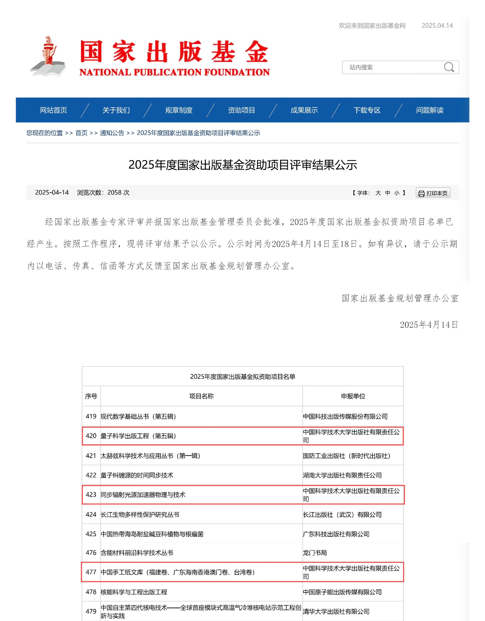 近日,2025年度国家出版基金资助项目评审结果公示,559个项目获批(全国共计580余家出版社),中国科大出版社申报的《量子科学出版工程(第五辑)》《同步辐射光源加速器物理与技术》《中国手工纸文库(福建卷、广东海南香港澳门卷、台湾卷)》3个项目成功入选,数量居全国出版社前列。