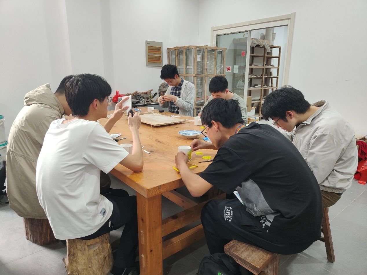 “切泥、揉泥、拍打、上片……”跟随着导师的讲解,同学们纷纷挽起袖口,手持木搭子在工作台前跃跃欲试。特聘导师周先稠教授轻托学生手腕,一边示范一边指导:“科研追求效率,但手艺讲究‘慢工出细活’!”同学们全神贯注地投入创作,一捏一揉间,那些酝酿多时的创意,正通过指尖的温度缓缓具象,映照着传统匠艺与年轻思维的对话。