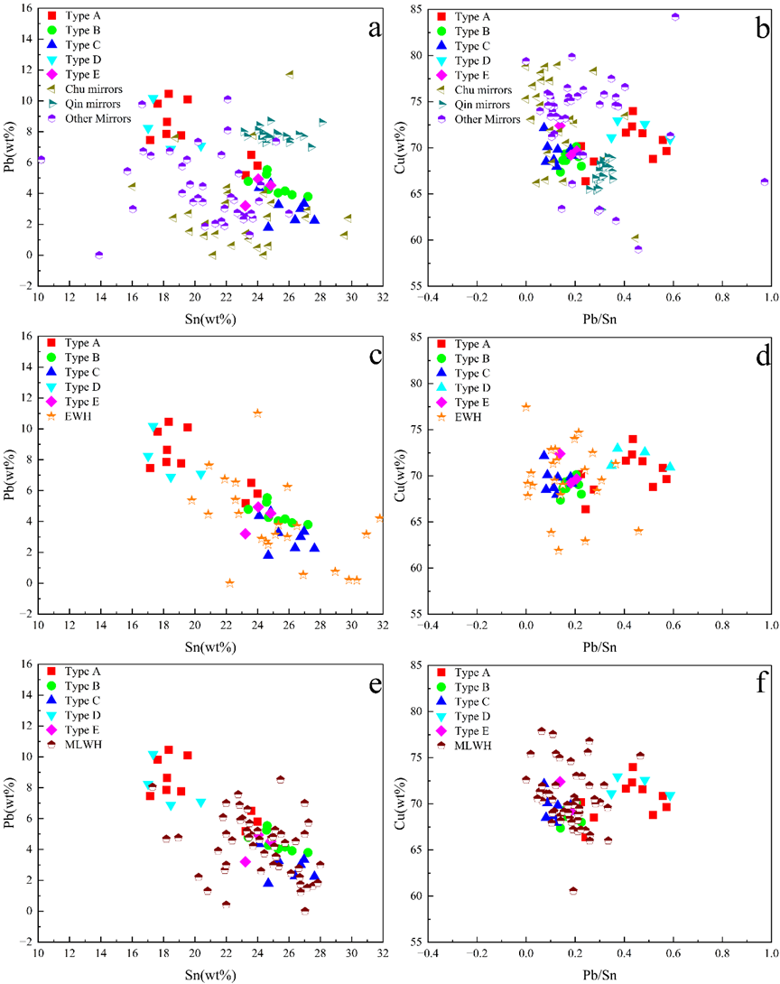 图2.六安地区五类蟠螭镜与中国战国至西汉时期铜镜的合金组成对比图