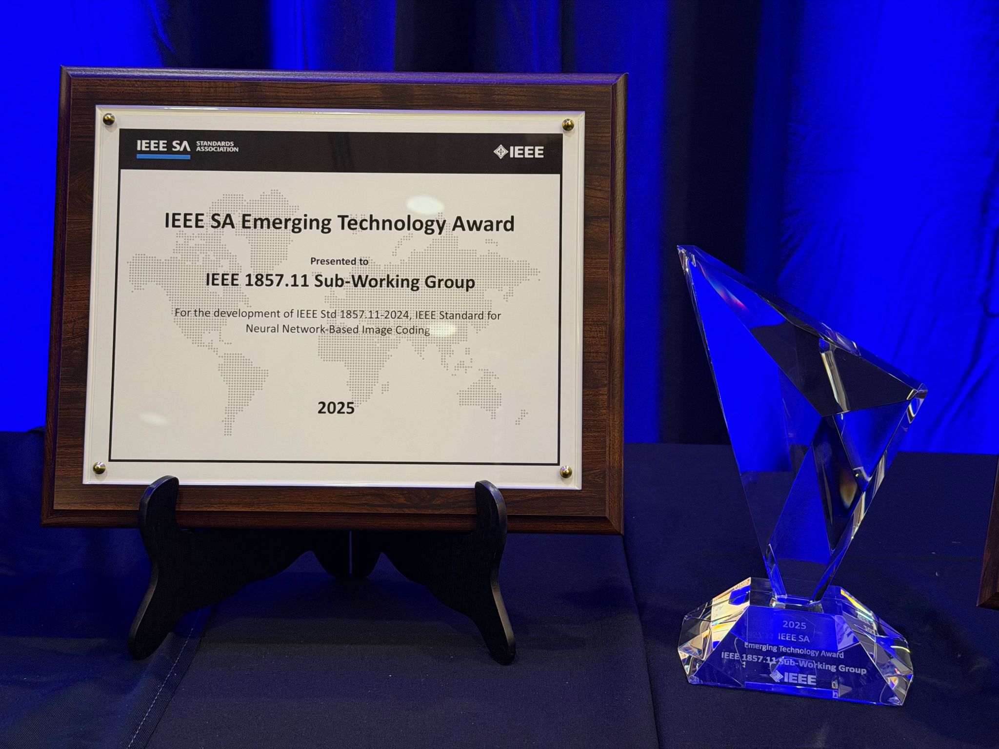 12月7日,在美国新泽西州泽西城举行的IEEE标准协会颁奖仪式上,IEEE 1857.11工作小组因制定《IEEE基于神经网络的图像编码标准》(标准号IEEE Std 1857.11-2024)获得IEEE标准新兴技术奖(IEEE SA Emerging Technology Award)。IEEE 1857.11工作小组主席为中国科大信息科学技术学院刘东教授,信息学院多名师生参与该工作小组的标准制定工作。工作小组成员单位还包括字节跳动、腾讯、大华、上海双深等企业和北京大学、南京大学、武汉大学、上海交通大学等高校。