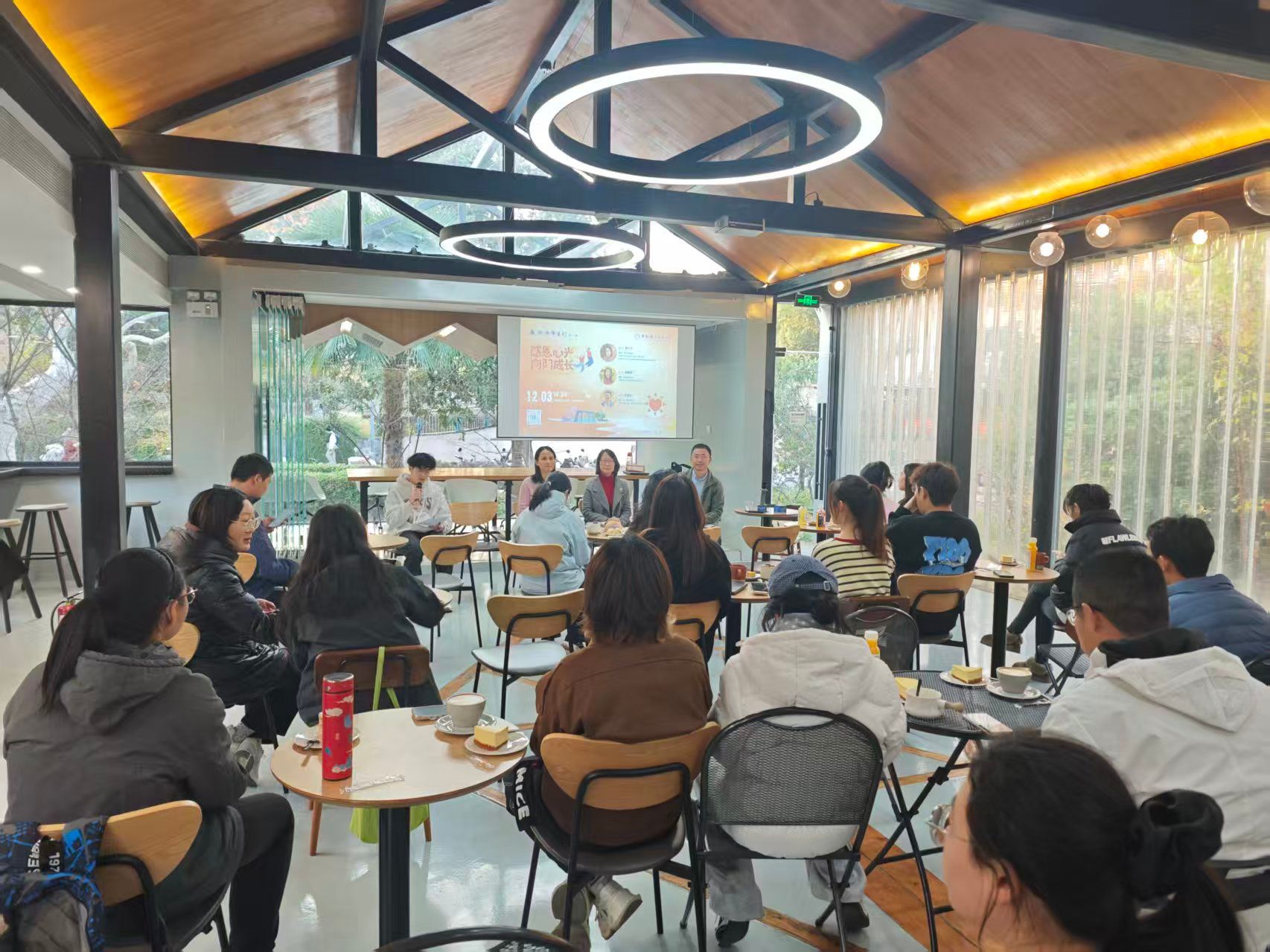 12月5日,第十七期“瀚海师生行”活动在中国科学技术大学东区1958咖啡厅举办。本期活动以“感恩心光,向阳成长”为主题,作为学校心理健康主题活动月系列活动之一,特邀夏红卫、宫晓梅、李春生三位在心理健康领域拥有丰富经验的嘉宾,与同学们展开了一场贴近心灵、启迪成长的对话。活动由少年班学院2023级2班心理委员、微笑心理协会副社长杨硕同学主持,吸引了来自各院系的师生积极参与。
