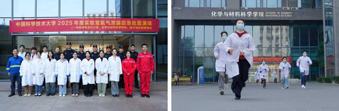 11月14日上午,实验室安全办公室、化学与材料科学学院、保卫与校园管理处在东校区环资楼联合开展了“中国科学技术大学2025年度实验室氢气泄漏应急处置演练”,模拟了实验室氢气钢瓶发生泄漏,氢气监测仪发出警报的事故场景。参与演练的师生顺利完成了实验室发生氢气泄漏时有效的紧急处置、人员疏散、事故上报、防护装备正确穿戴、专业检测等应急处置流程。此次演练强化了我校师生对实验室气瓶安全事故的防范意识和对易燃易爆气体泄漏事故应急处置流程的掌握,为营造安全的实验环境奠定了良好的基础。