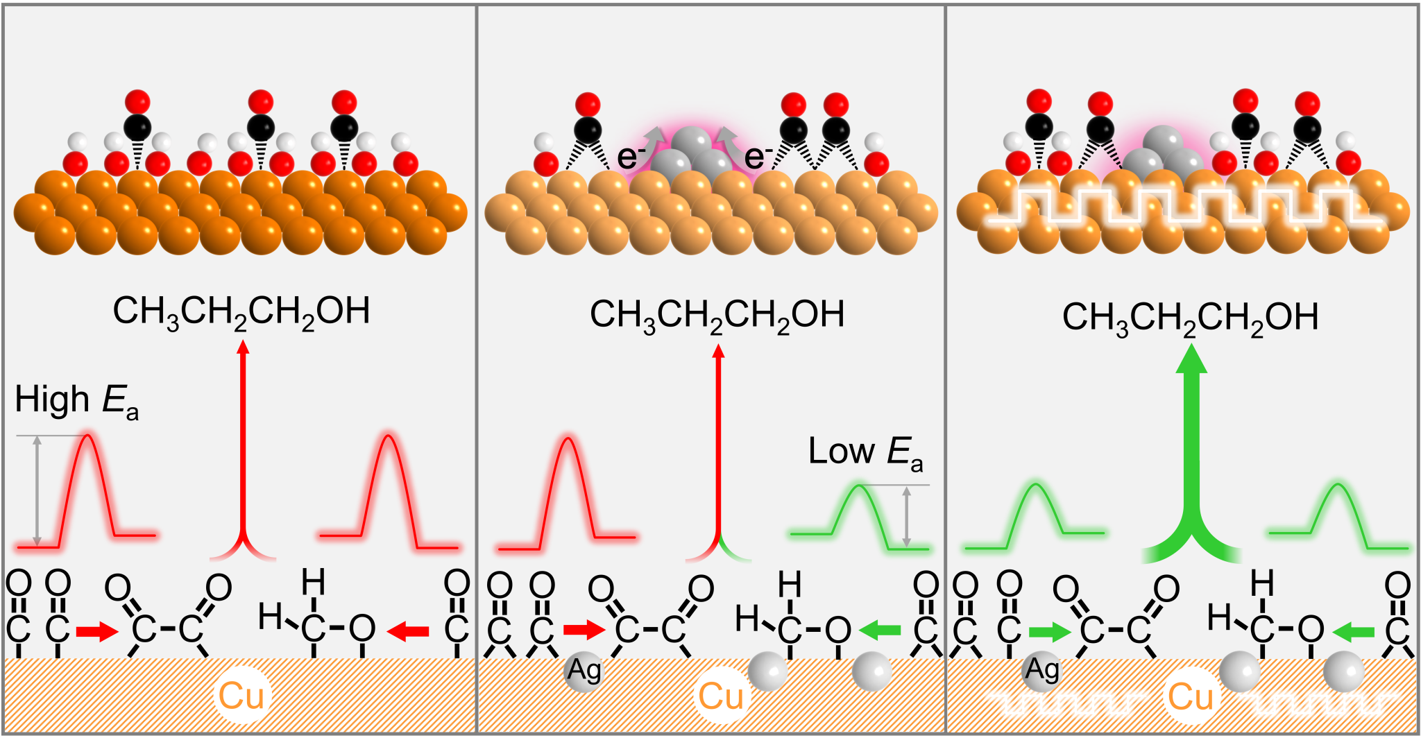 正丙醇的合成涉及复杂的C1-C1二聚与后续的C1-C2耦合步骤,其关键在于实现*CH2O与*OCCO中间体的协同吸附。该转化路径受CO在催化剂表面吸附构型的显著影响:顶位吸附与桥位吸附共存促进*OCCO形成,而桥位吸附则更利于*CH2O生成。因此,精准调控催化剂表面CO顶位吸附与桥位吸附的分布是平衡关键中间体数量,提升正丙醇选择性的重要途径。研究人员通过在氧化物衍生铜中引入银组分构建新型复合催化剂,采用脉冲电解模式,成功实现了对顶位吸附与桥位吸附共存构型的精准调控。机理研究表明,银的引入与脉冲电解之间存在协同效应,二者通过调节表面OH覆盖度来调控CO的吸附构型。此外,脉冲电解破坏了界面水分子氢键网络结构,使反应主导机制由Eley-Rideal路径转向Langmuir-Hinshelwood加氢路径。这一机制转变从本质上解释了在创制的复合型催化剂上高选择性生成多碳醇的实验现象。