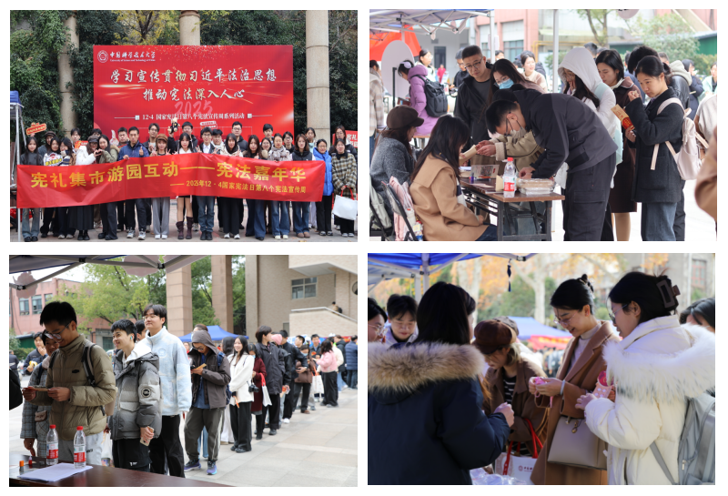 当日,还举行了以“宪礼集市 游园互动”为主题的宪法嘉年华活动和“我为师生办实事”法律咨询服务活动。宪法嘉年华现场分为普法游戏区和沉浸式体验活动区。普法游戏区以宪法知识为主题,设置了法韵流转、法鉴澄明、明辨宪章、法意寻踪、法理归源、魔方识宪等多个普法小游戏。沉浸式体验活动区则以非遗为媒,设置了法意丹青、清音法铃、宪香四溢等多个传统文化体验小活动。“我为师生办实事”法律咨询服务活动特别邀请了学校4位常年法律顾问作为嘉宾,采取“一对一咨询+法律盲盒”相结合的形式,为师生提供法律咨询服务。活动吸引大量师生前来咨询,从租房押金纠纷到网购维权,从劳动就业问题到日常权益保护,嘉宾们认真倾听咨询者的问题,凭借专业的法律知识和丰富的实务经验为师生提供专业解答与维权指引。嘉宾们亲切的服务态度和扎实的专业水准得到了师生的好评,切实为师生学习生活中的法律需求提供了有效支持。