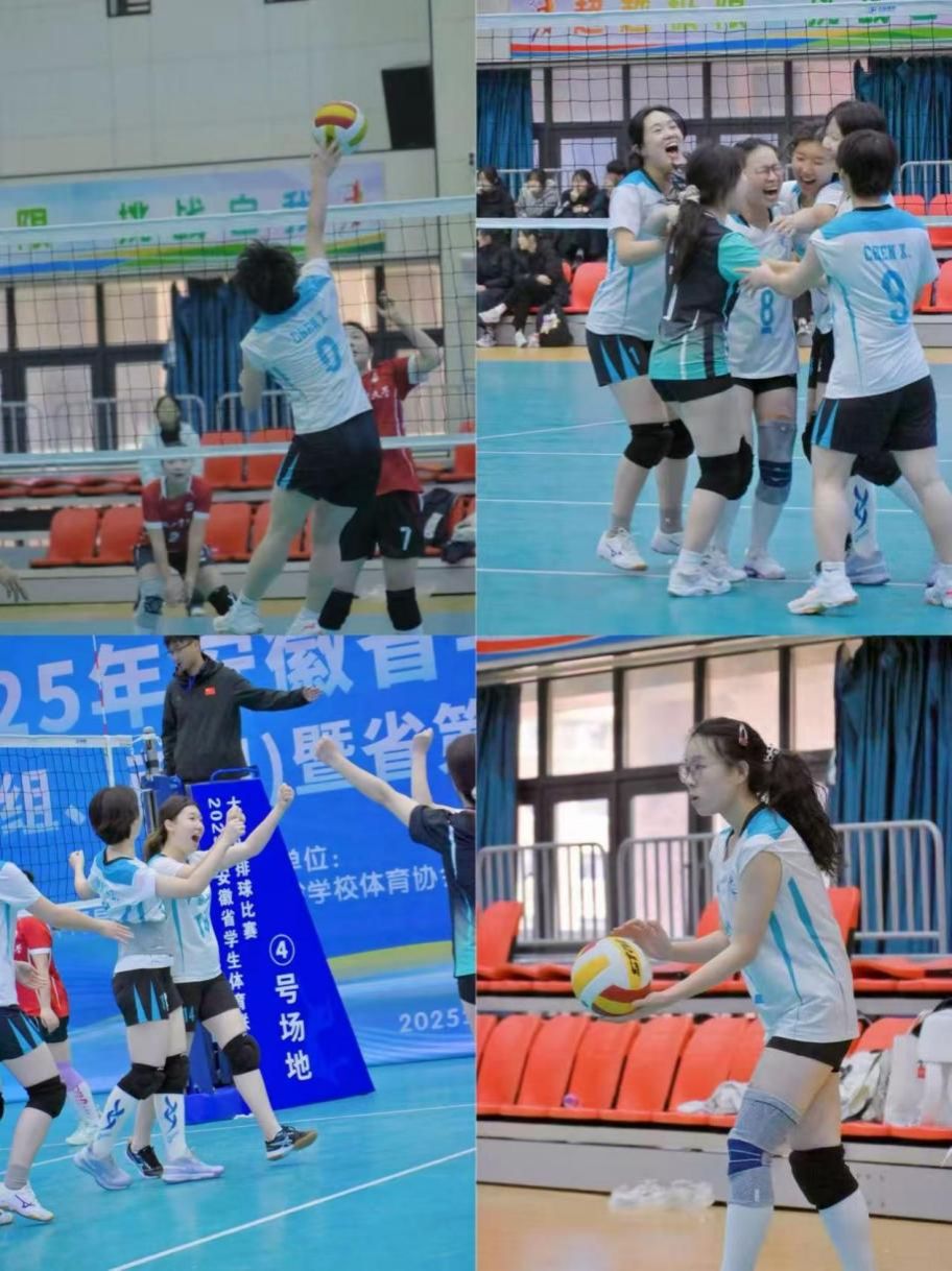 在司友志老师指导下,校男排队展现出了强大的赛场把控力。小组赛阶段,男排队员配合默契,四战全胜以小组第一强势出线。在四分之一交叉赛中,面对安徽大学队的顽强阻击,队员们沉着冷静,凭借犀利的发球和稳固的拦网连续下分,挺进四强。在随后的半决赛,男排队稳定发挥,以3:0战胜安徽农业大学队。决赛中,面对实力强劲的安徽工业大学队,男排运动员们毫无惧色,比赛过程跌宕起伏,双方比分交替上升,在关键的第4局,全队迅速调整战术,顶住压力,最终以3:1战胜对手,成功问鼎。