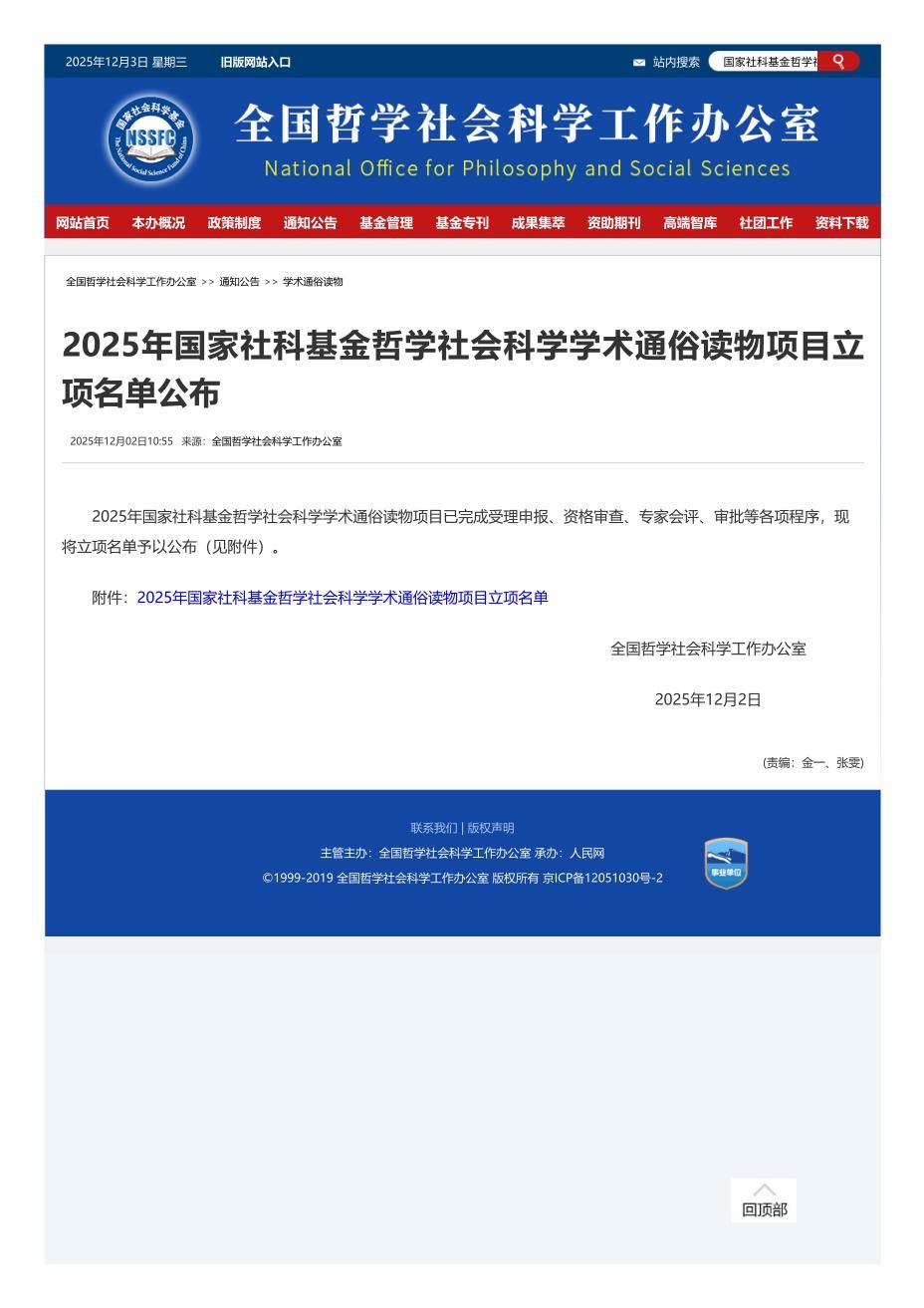 12月2日,2025年国家社科基金哲学社会科学学术通俗读物项目立项名单公布。本次项目依托出版社实行限项申报,全国共有580余家出版单位参与,每家出版社限报3项。经专家评审团队多轮严格遴选,最终仅33个项目获准立项。我校人文与社会科学学院科技传播系副教授张燕翔申报的《技以载道:中华科技艺术史话》入选。