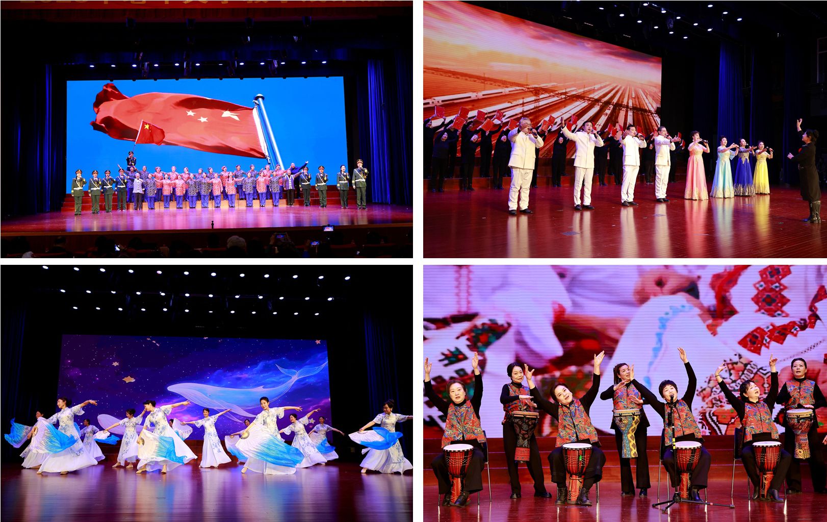 艺彩纷呈,银发舞台展风华。歌咏(南区1班)率先登场,以气势恢宏的合唱《军民一条心》点燃现场气氛,激昂的旋律展现出军民同心、砥砺前行的磅礴力量。形体训练班(南区)带来模舞秀《共和国走向未来》,步伐铿锵、姿态昂扬,诠释着对祖国美好明天的憧憬。诗词欣赏与写作班的古诗词诵读吟唱《静夜思》《题岳阳楼》,将古典诗词与悠扬旋律相融,尽显中华传统文化的韵味与魅力。柔力球班的《走天涯》舒展灵动,球拍翻飞间展现出柔力球运动的独特韵律。歌咏班(东区)献上合唱《我爱你,亲爱的祖国》,嘹亮歌声中满含对祖国的赤诚与热爱。中国科大附属第一医院分校带来健身气功《承古导引双法合一》,动作舒缓、气韵贯通,彰显传统养生文化的深厚底蕴。舞蹈高级班演绎的《化身孤岛的鲸》,以曼妙舞姿诠释细腻深情,传递出深邃而动人的情感力量。太极班(南区)的《太极伞》刚柔并济,伞影流转间尽显太极的沉稳与飘逸。