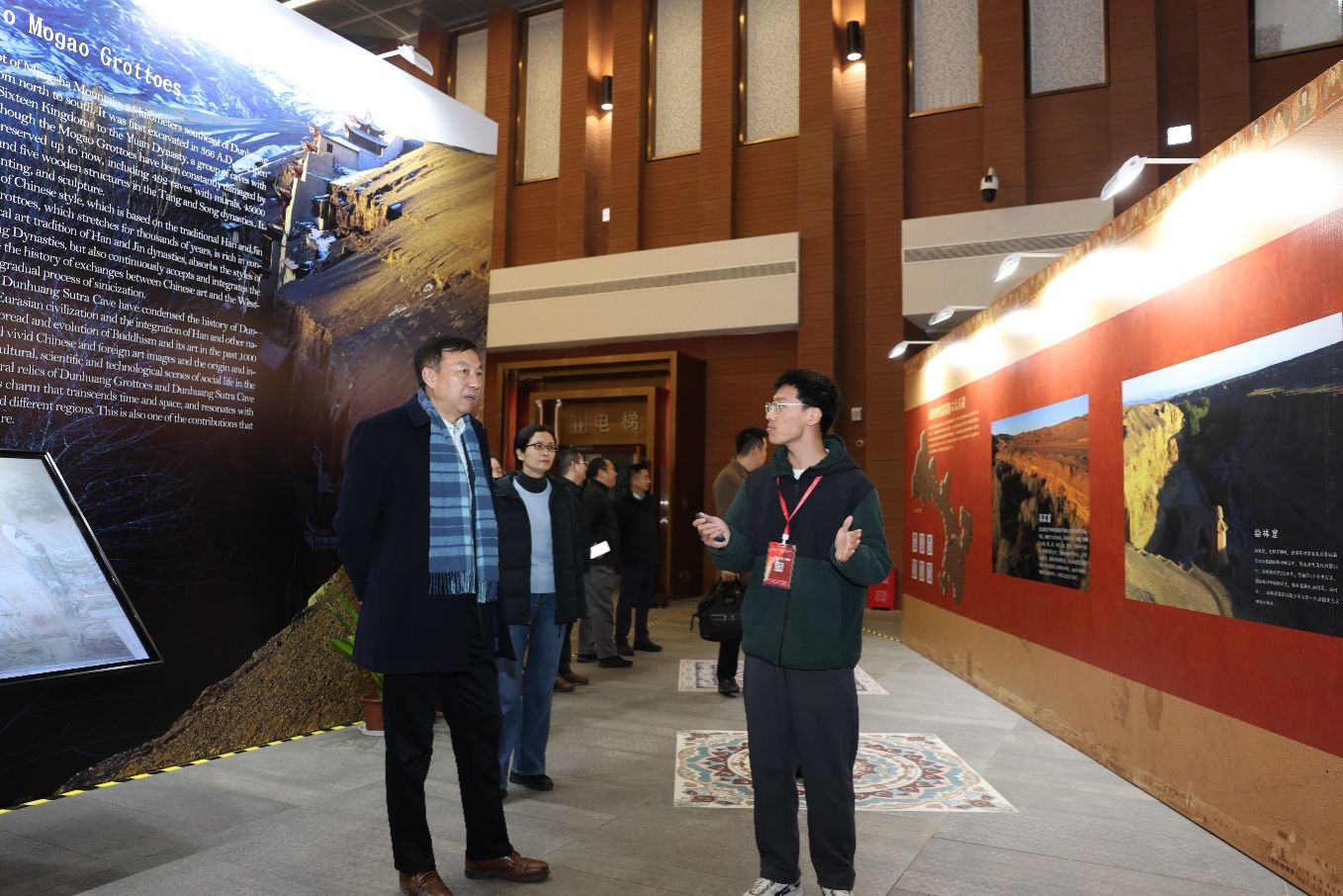 在高新校区图书馆,舒歌群调研了“丝路华章时空交响”敦煌壁画艺术精品高校公益巡展情况,听取在场志愿者同学讲解。他指出,文化繁荣兴盛是中国式现代化的重要标志,敦煌文化博大精深,希望同学们在参观的过程中切身感受中华优秀传统文化的魅力,厚植家国情怀,坚持传承创新,共同打造有活力、有内涵的校园文化。