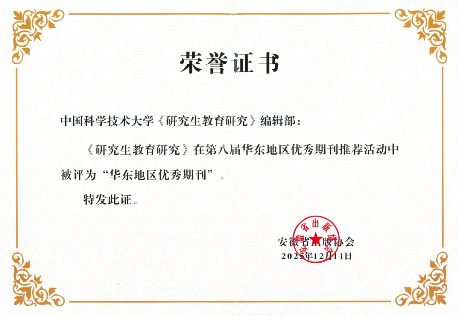 “华东地区优秀期刊”由华东地区期刊协会联盟组织评选,每4年评选一次,旨在激励期刊出版单位提高期刊出版水平,发挥优秀期刊示范带动作用,推动各类期刊高质量发展。第八届评审工作于2025年9月启动,经各省(市)期刊协会初评确定“省级优秀期刊”并择优推荐、华东地区优秀期刊评审委员会终评审议,安徽省共有《研究生教育研究》等37种期刊获评第八届“华东地区优秀期刊”。