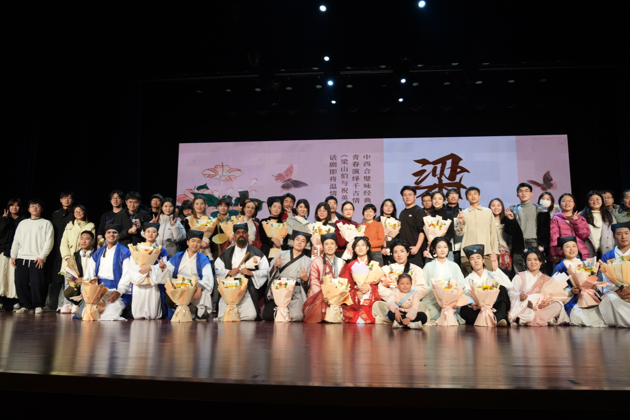 12月28日,由校图书馆与国际学院联合主办、图书馆语言学习与国际交流中心承办的英文话剧《梁山伯与祝英台》在东区大礼堂圆满落幕。本场演出由学校中外师生联袂呈现,巧妙融合古代风雅与现代舞台艺术,生动再现了梁山伯与祝英台化蝶双飞的传奇故事,吸引线上线下2300余名观众共同观看。