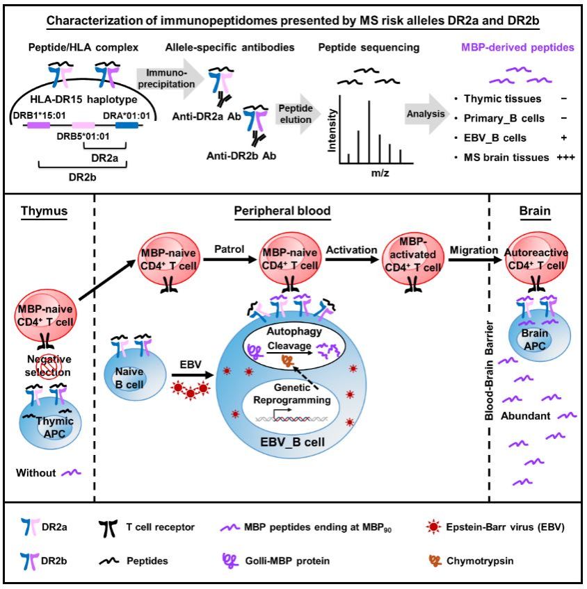 2026年1月14日,中国科学技术大学生命科学与医学部、免疫应答与免疫治疗全国重点实验室王剑教授课题组与苏黎世大学Roland Martin教授课题组合作在《Cell》期刊在线发表题为“EBV Infection and HLA-DR15 Jointly Drive Multiple Sclerosis by Myelin Peptide Presentation”的研究论文。该研究通过免疫多肽谱分析和自身反应性CD4+T细胞功能鉴定,揭示了爱泼斯坦-巴尔病毒(EBV)感染与人类白细胞抗原HLA-DR15协同作用,通过呈递髓鞘自身抗原多肽并激活自身反应性CD4+T细胞,共同驱动多发性硬化症(MS)发生的新机制。
