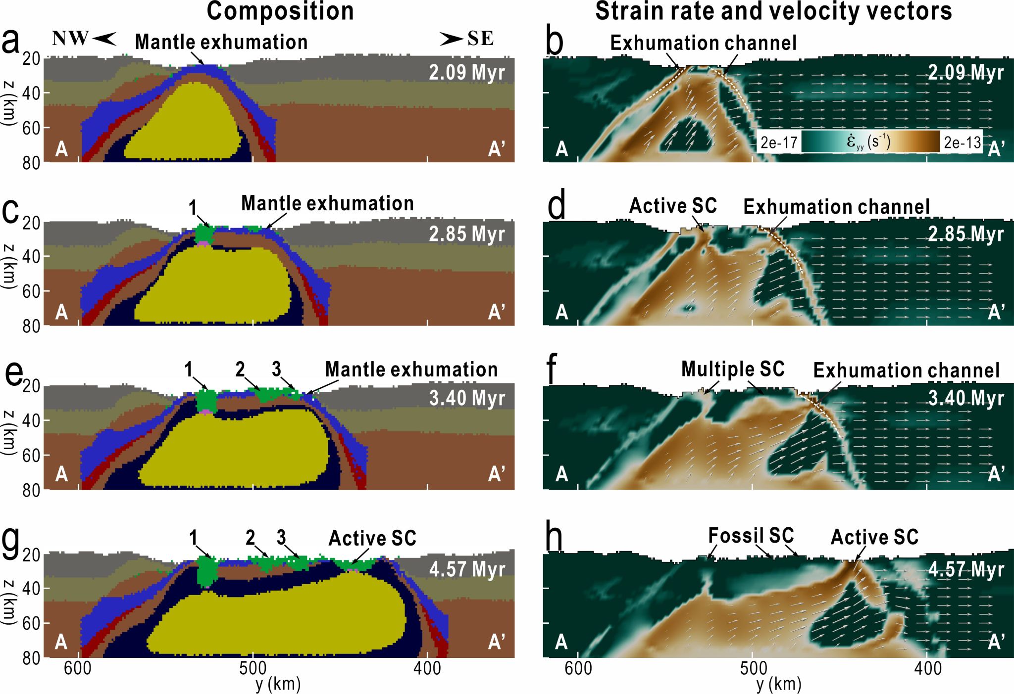 图2,模型演化过程,成分场(a, c, e, g),应变速率耦合速度场(b, d, f, h).