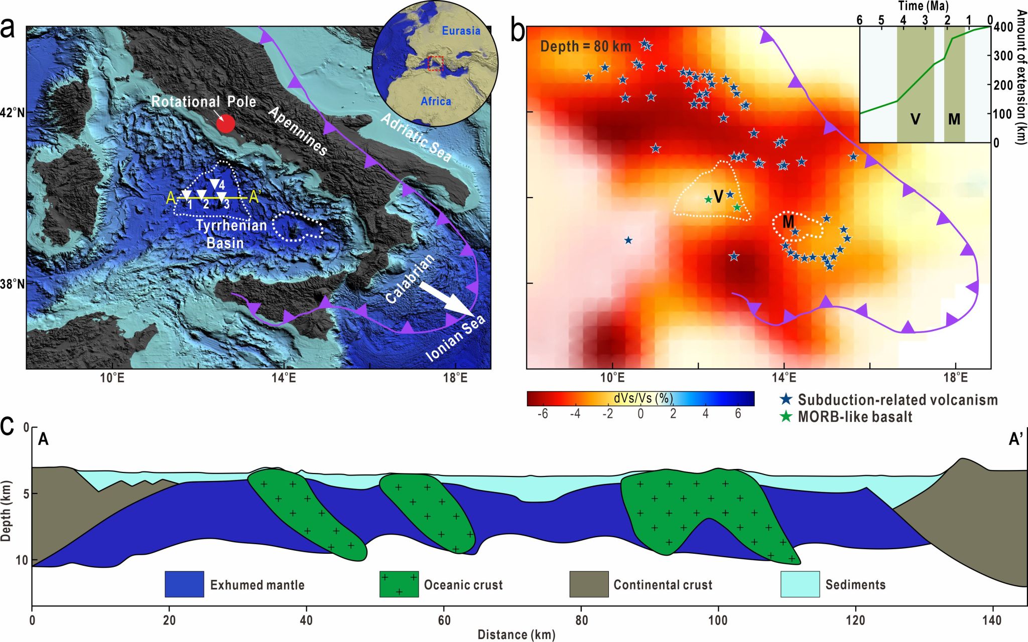 图1,第勒尼安盆地地质简图(a, b)和洋陆转换结构(c).