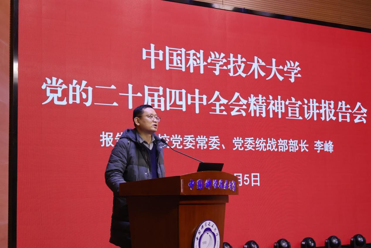1月5日下午,学校在东区水上报告厅召开学习贯彻党的二十届四中全会精神宣讲报告会。校党委常委、党委统战部部长李峰作学习宣讲。校党委委员、少年班学院党总支书记孙广中主持报告会。少年班学院、数学科学学院、地球和空间科学学院师生代表,校内各民主党派、无党派人士代表参加报告会。