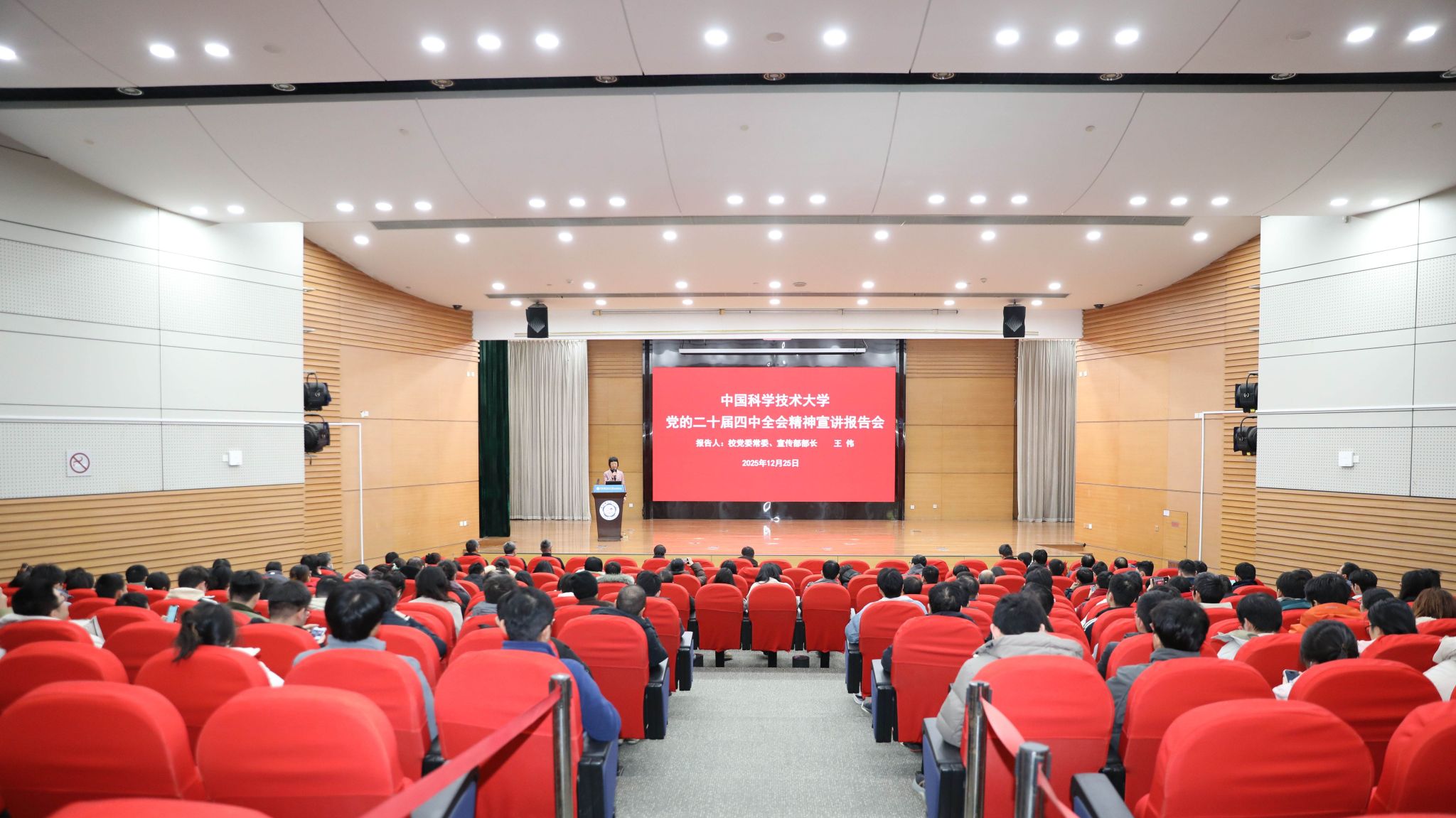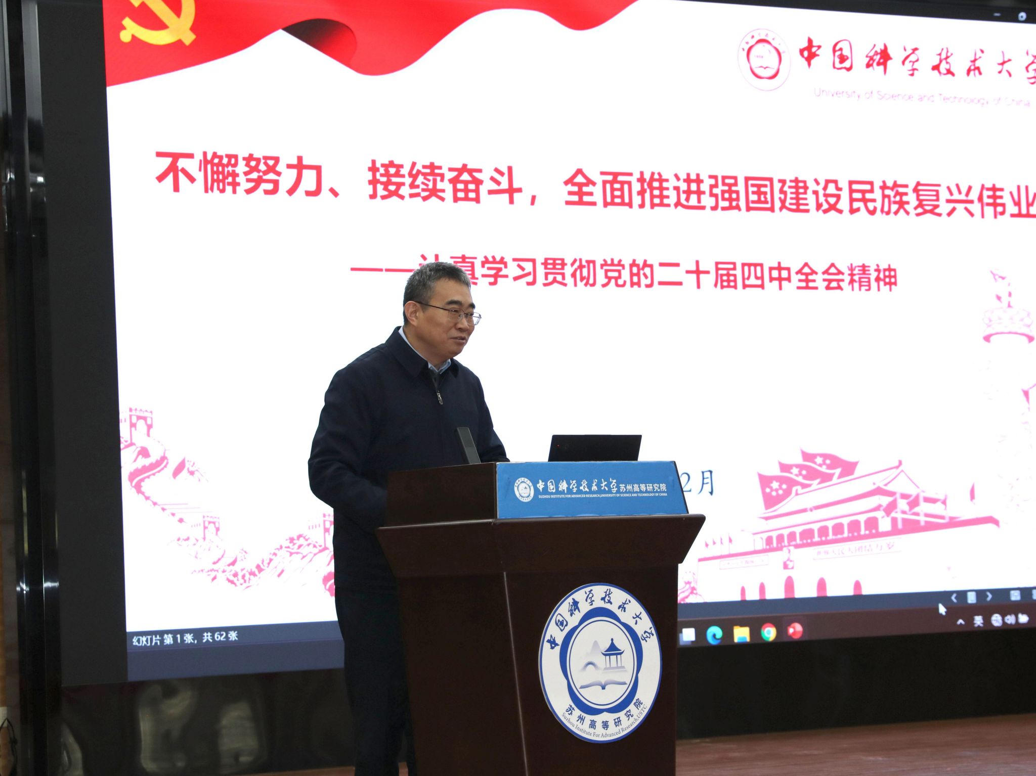 12月25日, 中国科学技术大学 苏州高等研究院在唯真楼一楼报告厅召开学习贯彻党的二十届四中全会精神宣讲报告会。中国科大党委常委、宣传部部长,苏州高等研究院党委书记王伟作宣讲报告,苏州高研院党委副书记魏英主持报告会。苏州高等研究院党政班子成员,各教学单位、实验室及院部全体教职工、学生代表近300人参加报告会。