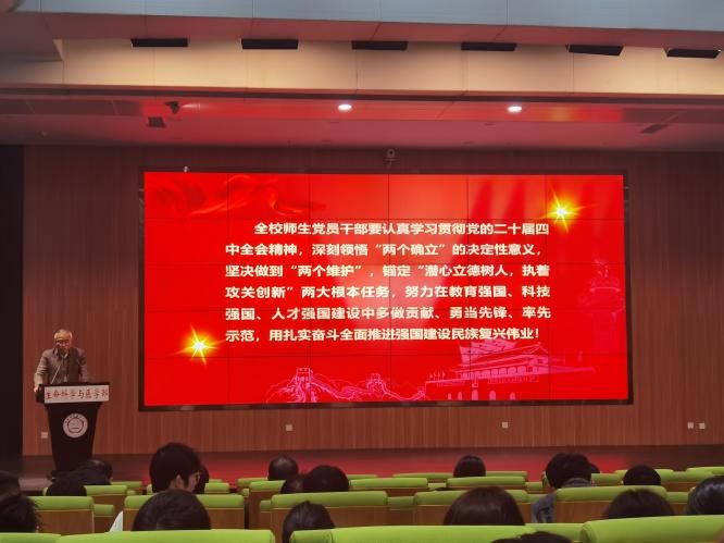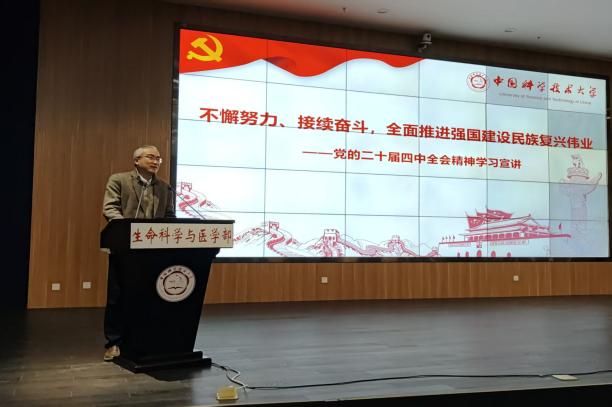 1月7日下午,校党委常委、校长助理、校学习贯彻党的二十届四中全会精神宣讲团成员薛天赴生命科学与医学部和火灾安全全国重点实验室宣讲党的二十届四中全会精神,作题为《不懈努力、接续奋斗,全面推进强国建设民族复兴伟业》的专题报告。报告会在西区生物楼一楼学术报告厅举行,火灾安全全国重点实验室党委书记朱霁平主持,生命科学与医学部、火灾安全全国重点实验室师生党员代表、教师代表参加会议。