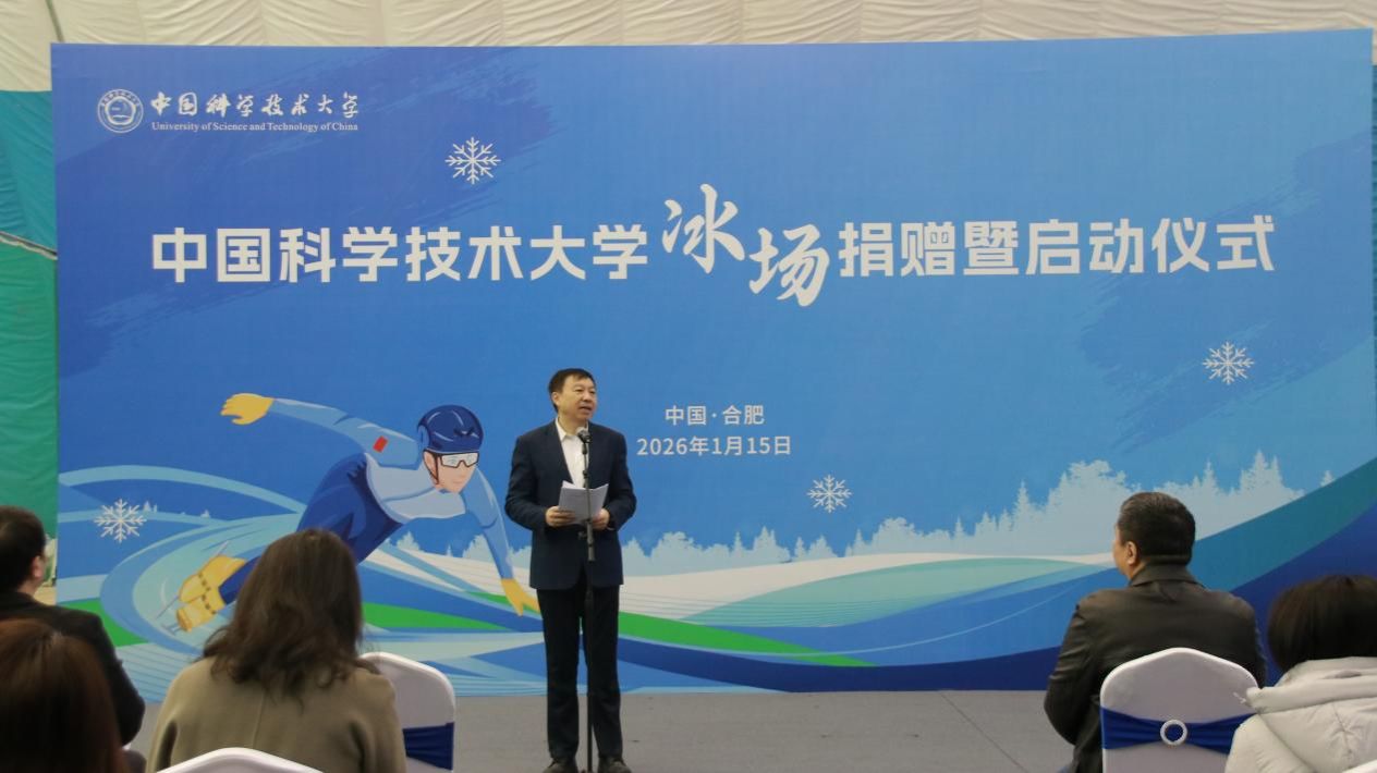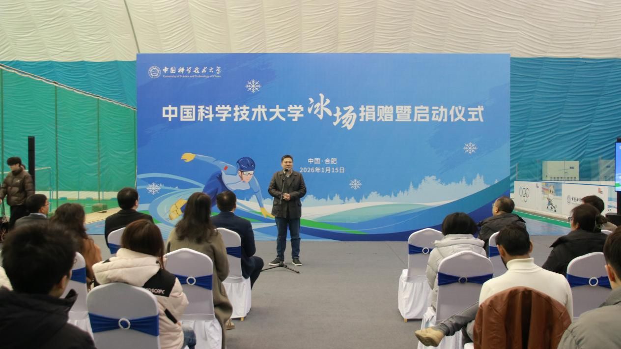 1月15日,中国科学技术大学CO₂绿色冰场捐赠暨启动仪式在西区气膜馆举行。我校2009级校友、合肥合锻智能制造股份有限公司董事长严建文,中国科大校党委书记、教育基金会理事长舒歌群院士,工程科学学院、碳中和研究院、对外联络与基金事务处、基本建设处、体育教育中心主要负责同志和学生代表出席仪式。仪式由对外联络与基金事务处副处长、教育基金会副秘书长赵林主持。