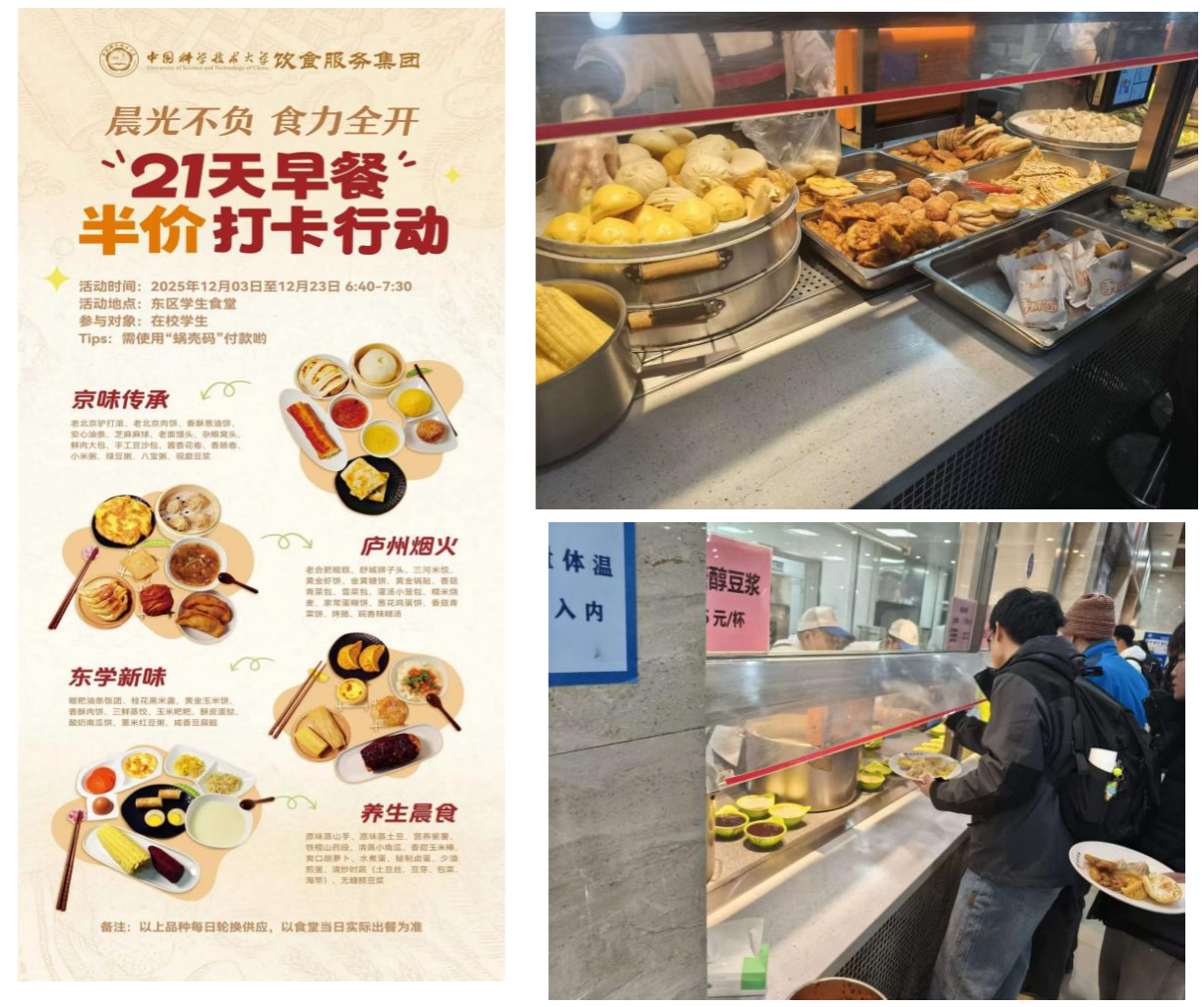 活动首先对近期举办的“21天早餐半价打卡行动”进行了回顾与总结。该活动在网络中心的技术支持下,于2025年12月3日至23日在东区学生食堂开展,旨在倡导健康作息,鼓励学生养成规律早餐习惯。期间,食堂同步推出“京味传承”“庐州烟火”“东学新味”“养生晨食”四大风味系列,丰富早餐选择,并通过半价优惠与连续打卡激励机制,有效引导学生早睡早起、健康生活。据统计,活动共吸引2253名学生积极参与,其中32名同学圆满完成连续21天打卡挑战,荣获“蜗壳自律之星”称号。