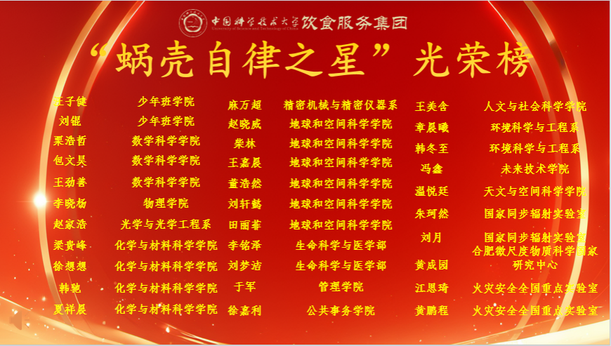 1月21日下午,“蜗壳自律之星”颁奖仪式暨“共话食事”座谈会在东区教工餐厅举行。校团委书记千坤、党委学生工作部(处)副部(处)长金顺玉、环境科学与工程系党总支书记张文真、生命科学与医学部党委副书记张隆华、核科学技术学院党委副书记周婷与来自全校14个院系的23名获奖学生代表共同参加。活动由饮食服务集团直属党支部副书记兼副总经理张静主持。