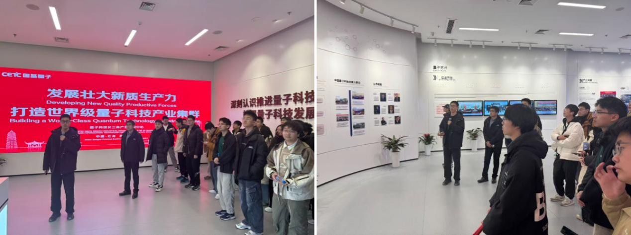 第四站,同学们走进中电科国基量子产业 (苏州) 有限公司。作为国家重点支持的前沿科技事业单位,国基量子聚焦量子计算机、芯片等核心技术研发,实行企业化管理。讲解员阐释了量子科技的战略意义——量子效率随量子个数呈指数增长,是突破传统计算瓶颈的关键。令同学们自豪的是,企业发展与母校渊源深厚,潘建伟院士等牵头推动技术突破,彰显了中国科大在该领域的引领作用。在实验室,三台已建成的量子计算机让同学们直观感受 “理论落地” 的震撼;座谈会上,企业负责人及在职科大学姐围绕招聘标准、实习安排、产业需求等答疑解惑,让同学们收获颇丰。