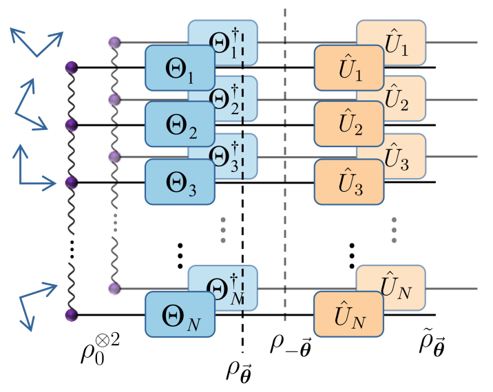 针对这一挑战,研究团队不再试图耗费资源去“对齐标尺”,而是另辟蹊径,建立了一套全新的理论框架。研究人员提出一种基于两拷贝局域幺正不变网络态的“反向编码”策略。如果将参考系失准比作一种“旋转迷雾”,传统的同向编码方式会让信号淹没在迷雾中无法识别。而团队提出的“反向编码”策略,则是在两个量子态拷贝上施加相反的参数编码操作。这种操作巧妙地打破了拷贝之间的交换对称性,使得被编码的参数信息不再被“旋转迷雾”掩盖。