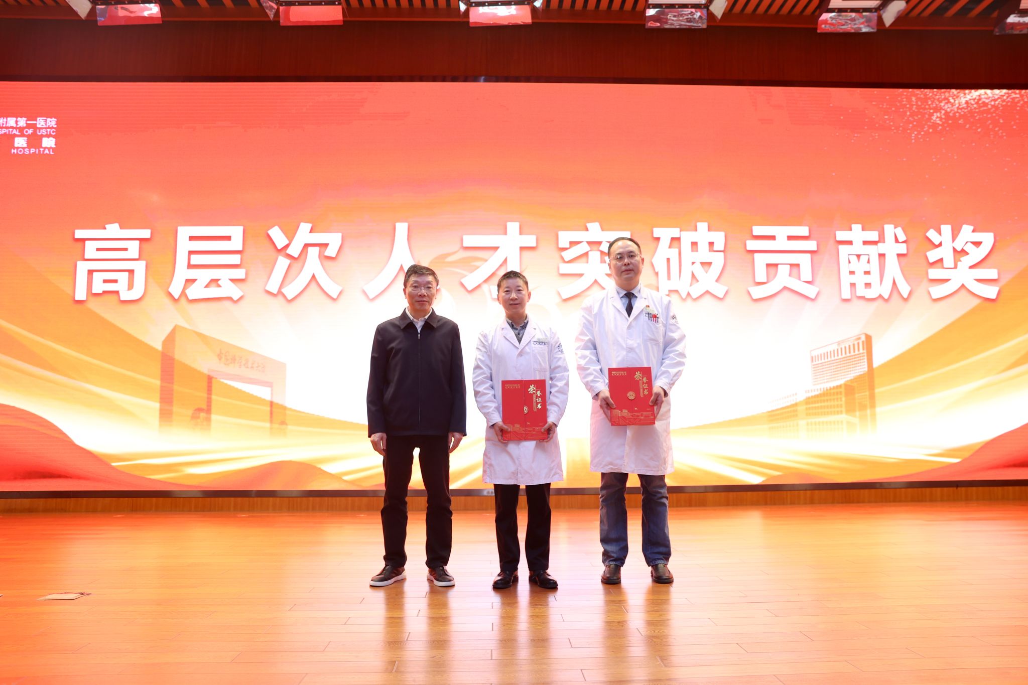 在随后召开的附一院2025年度总结表彰大会上,常进代表学校向过去一年来为附一院发展和“科大新医学”建设付出辛勤努力的医院干部职工致以崇高敬意和诚挚感谢,并为国家级重点人才项目入选者——附一院神经内科主任胡伟、骨科主任朱晨颁发“高层次人才突破贡献奖”,表彰两人在医学高层次人才队伍建设中的突出贡献,彰显学校对医学人才引育工作的高度重视。