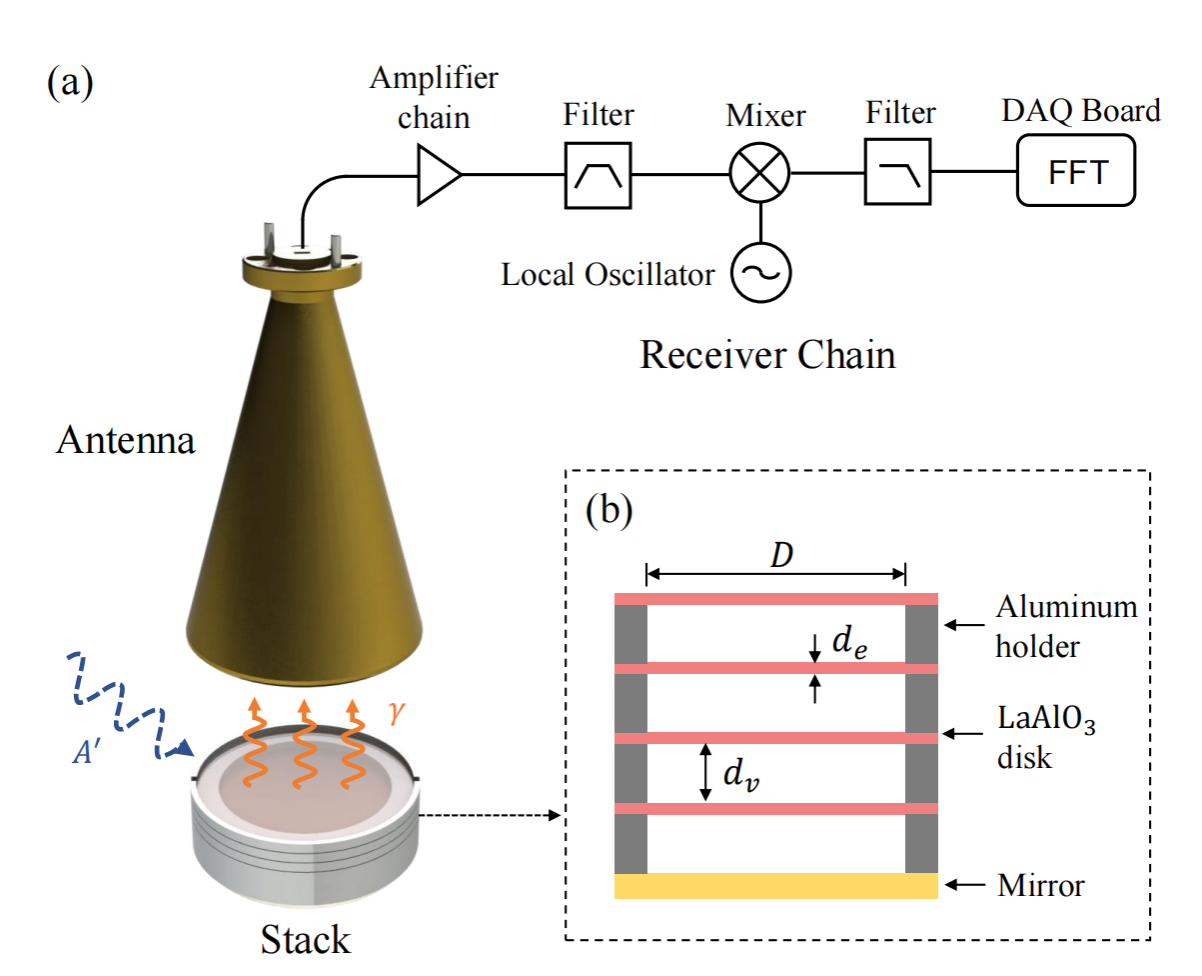 针对这一难题,研究团队设计并搭建了国际上首个工作在毫米波频段的电介质堆栈探测器。该探测器由四层铝酸镧电介质片和一面镜子组成(如上图所示),由于是开放腔设计,其等效模体积比普通谐振腔大约两个量级,且在未来可以通过增加电介质板数目进一步提升。电介质片的厚度与间距经过精心设计,使得探测器能够利用干涉显著放大暗物质激发产生的微波信号,并在W波段实现宽带搜寻。
