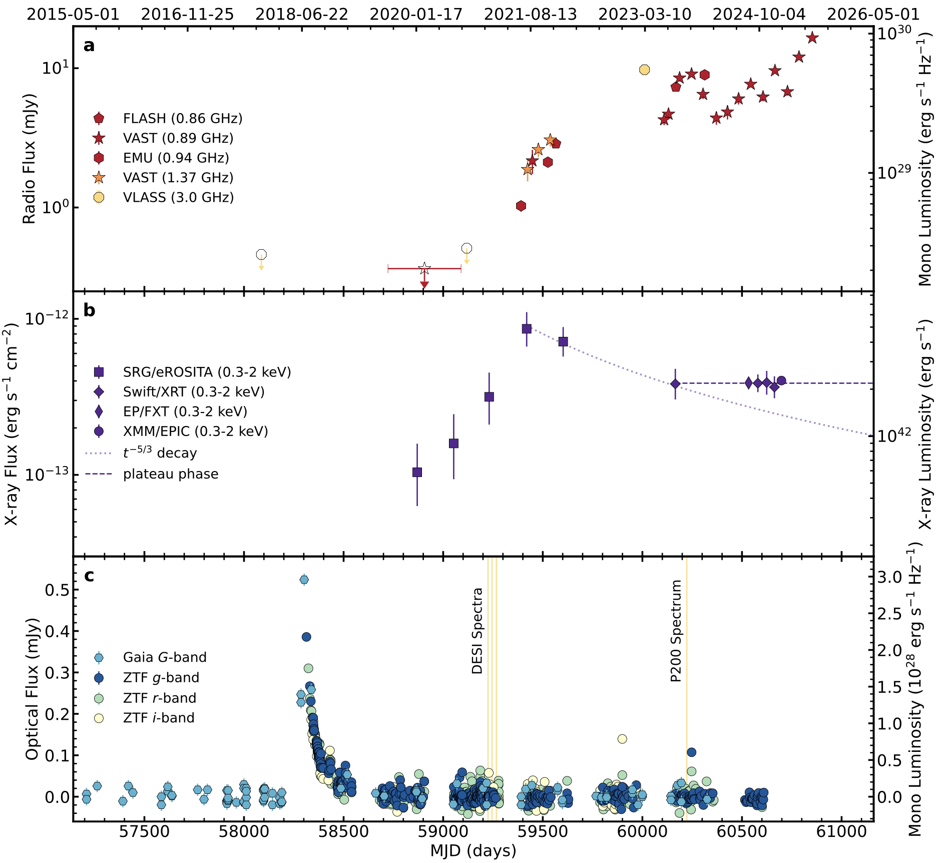 AT 2018cqh的光学、X射线、射电波段光变曲线