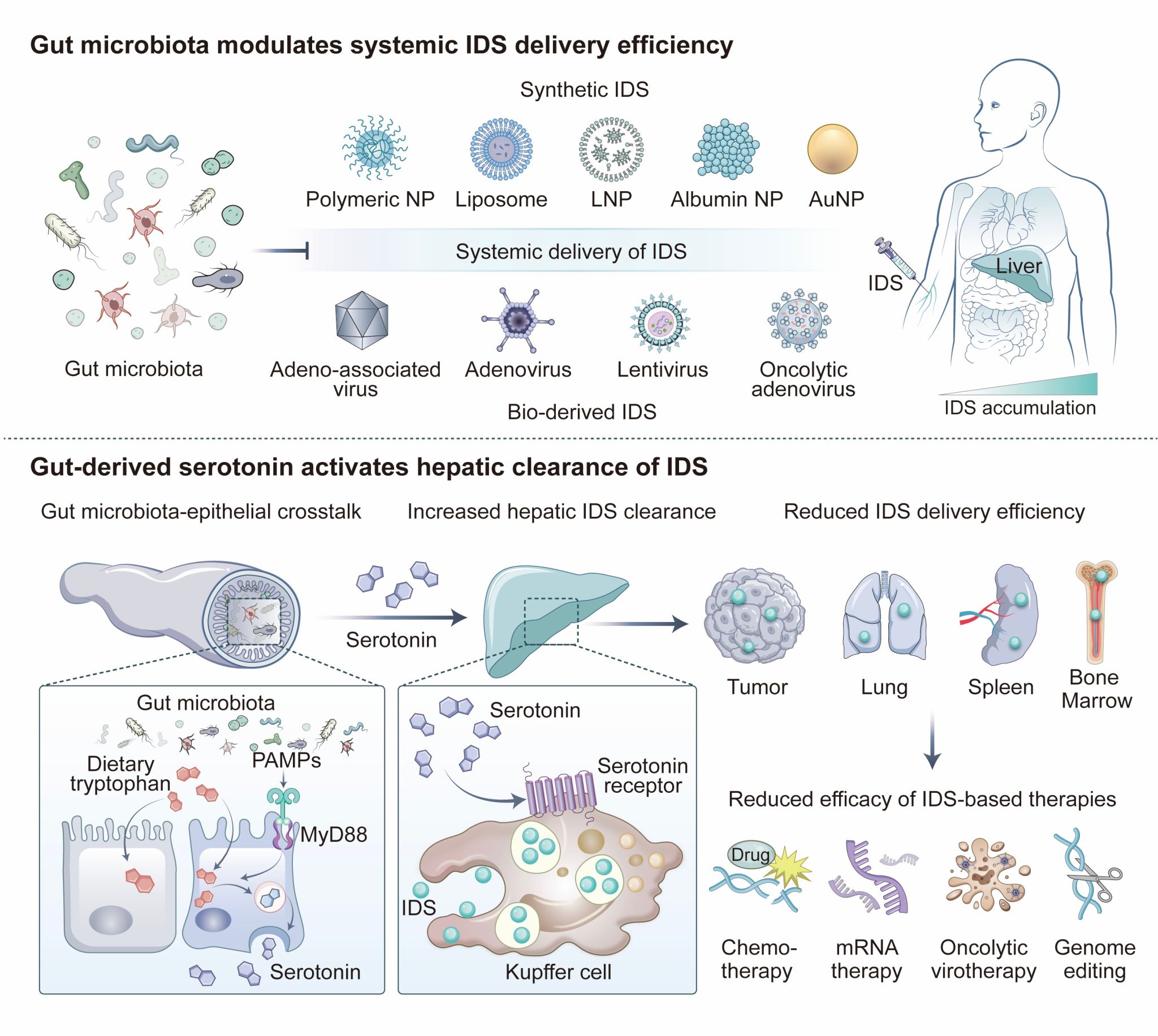 3月20日,中国科学技术大学王育才/朱书/蒋为团队在《科学》(Science发表题为“Commensal-driven serotonin production modulates in vivo delivery of synthetic and viral vectors”的研究论文,报道了一项递送科学领域的突破性成果。团队阐明了一条由肠道共生菌与肠道内分泌系统共同维持的肠—肝免疫调控轴。该轴可持续驱动机体清除药物递送载体,严重制约递送技术应用。干预该轴可显著抑制机体对递送载体的非特异性清除、改善药物循环,使肿瘤递送效率提升2-3倍、靶组织基因编辑效率提升10-15倍,从而为肿瘤靶向治疗、mRNA疗法、基因编辑等技术提供普适性疗效增强策略。该发现从机制层面破解了困扰递送领域数十年的“载体非特异性清除”难题,为推动递送技术的临床转化提供了普适性方案。